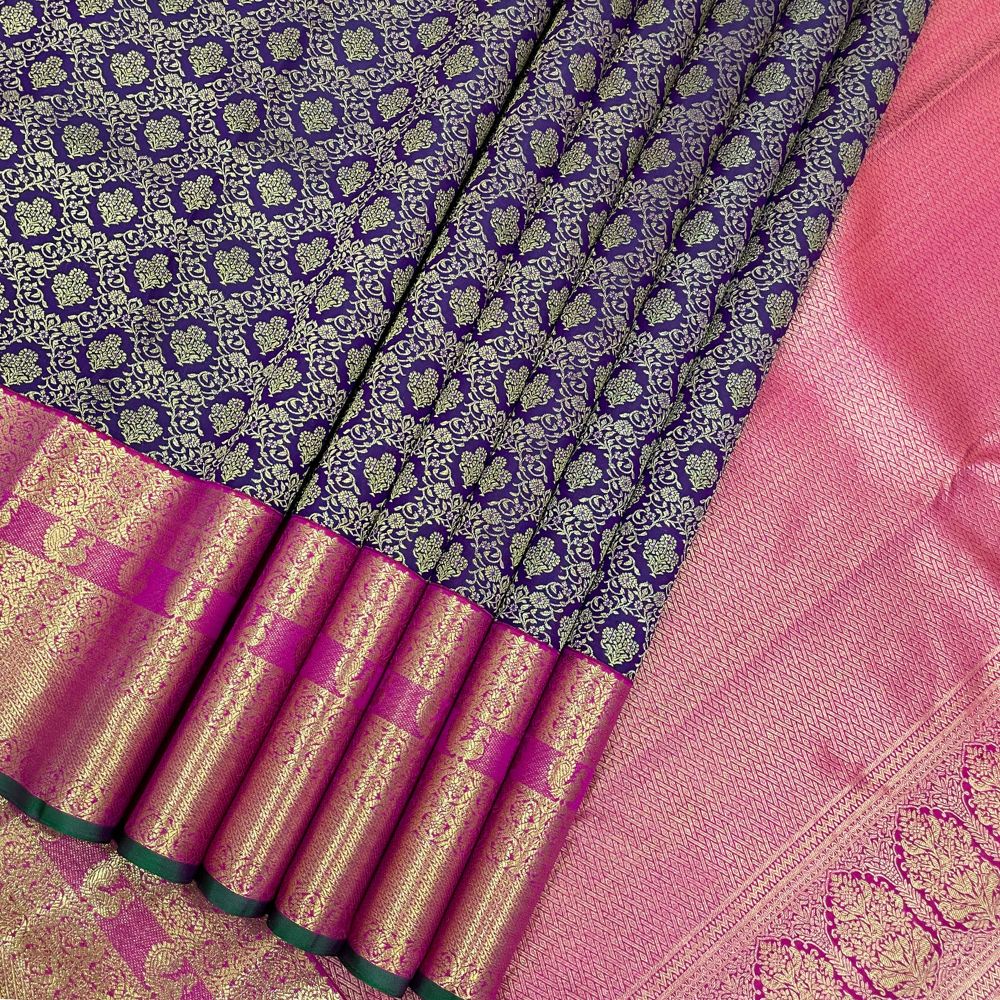 This exquisite bridal silk saree features a rich purple-blue base adorned with intricate gold zari and silk thread floral motifs, creating a grand and elegant look. Complemented by a rose pink pallu showcasing a multi-line rangoli design and a distinctive single-line peacock border, it blends traditional artistry with sophisticated style. Perfect for weddings and special occasions, this saree offers a timeless appeal that highlights craftsmanship and regal beauty.