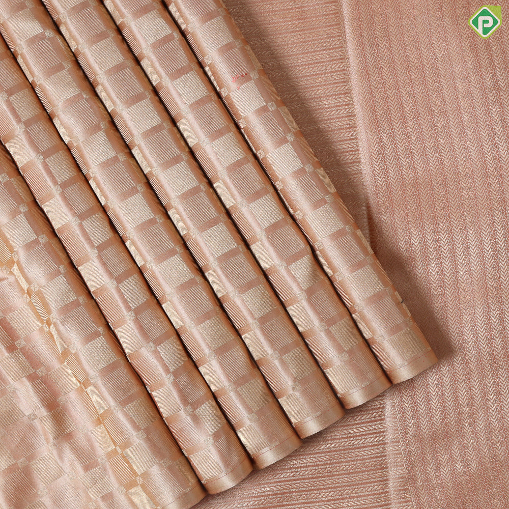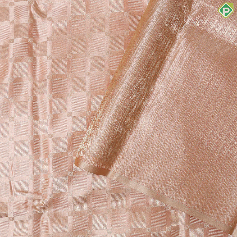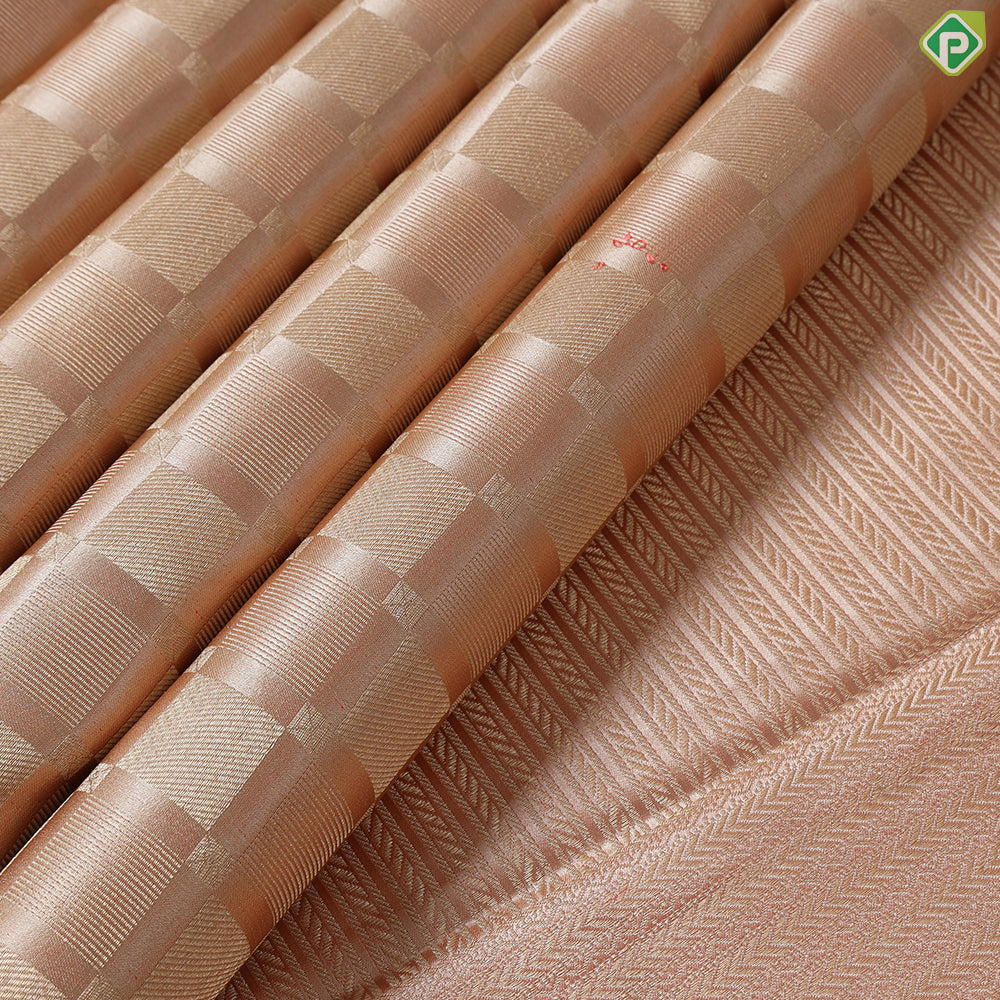 This khaki silk saree features an elegant gold zari self-designed checked square pattern, offering a sophisticated yet contemporary look. Its borderless design enhances versatility, making it ideal for both traditional occasions and modern celebrations. Crafted with expert precision, this trendy designer saree combines timeless silk quality with unique detailing to elevate your wardrobe.