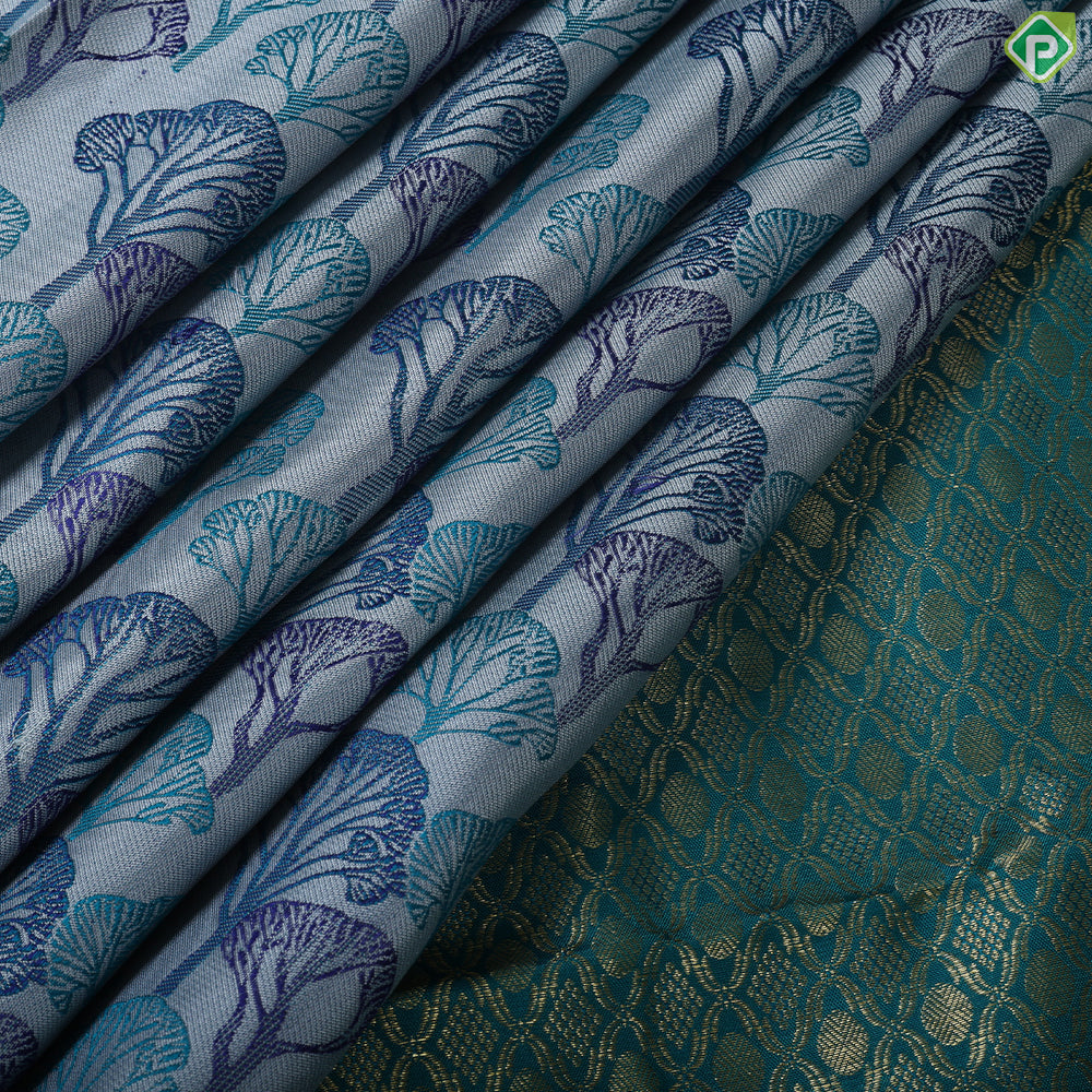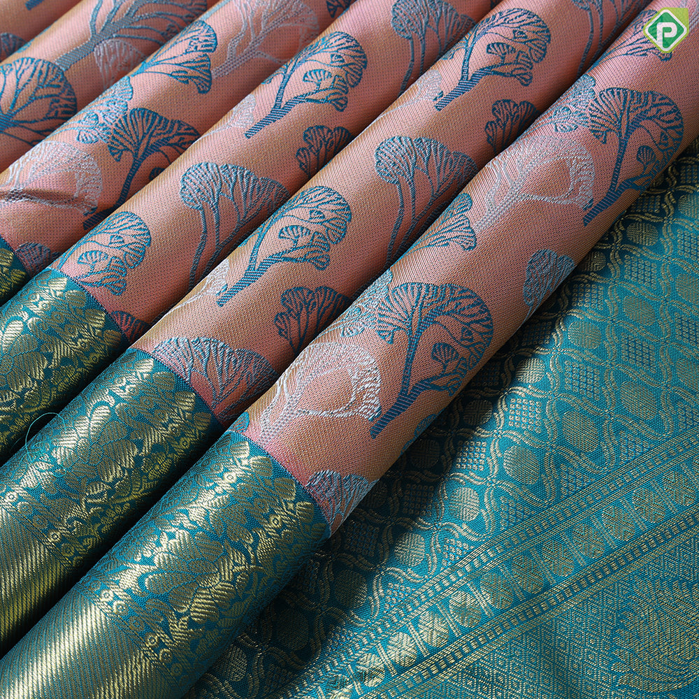 This elegant saree features an orangish pink base intricately woven with silk thread designs depicting forest trees in contrasting blue and green shades. The peacock green border is adorned with exquisite gold zari floral Retta pet patterns, blending traditional craftsmanship with contemporary style. Perfect for festive occasions, this saree offers a sophisticated look that highlights fine weaving and rich detailing.