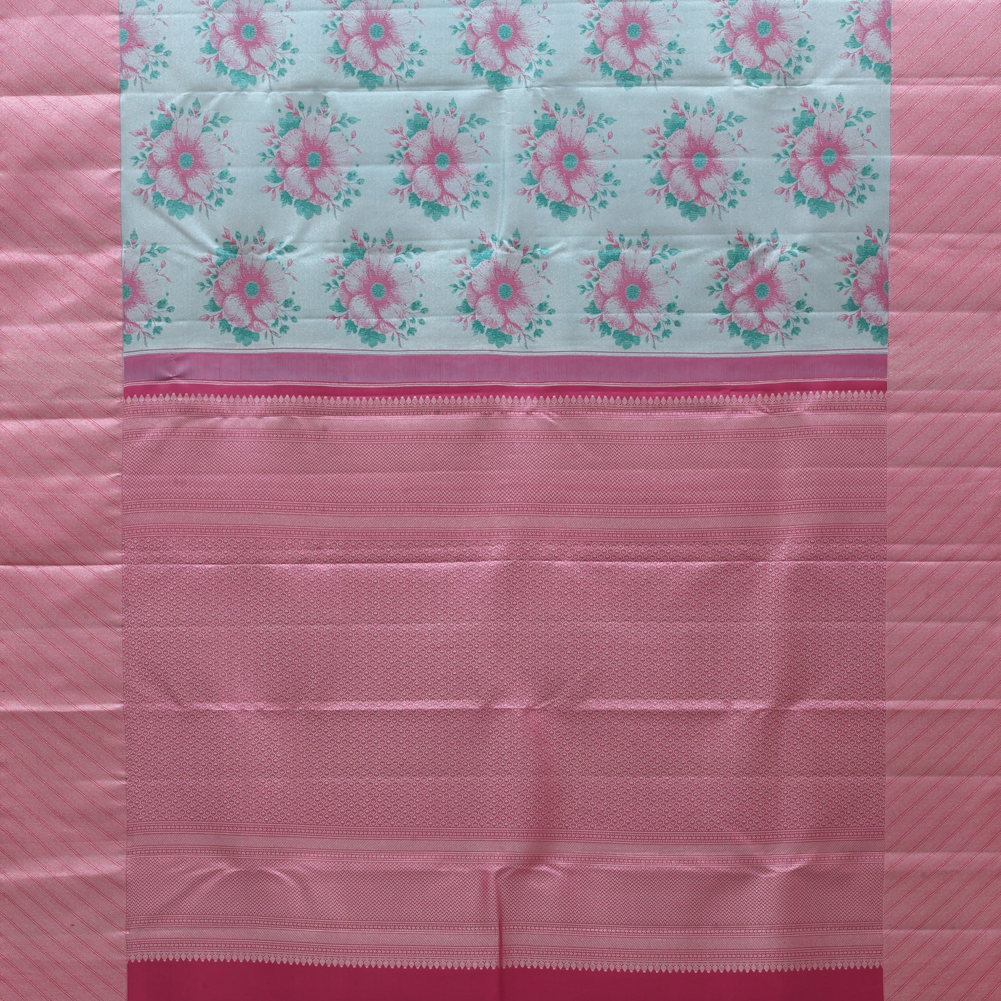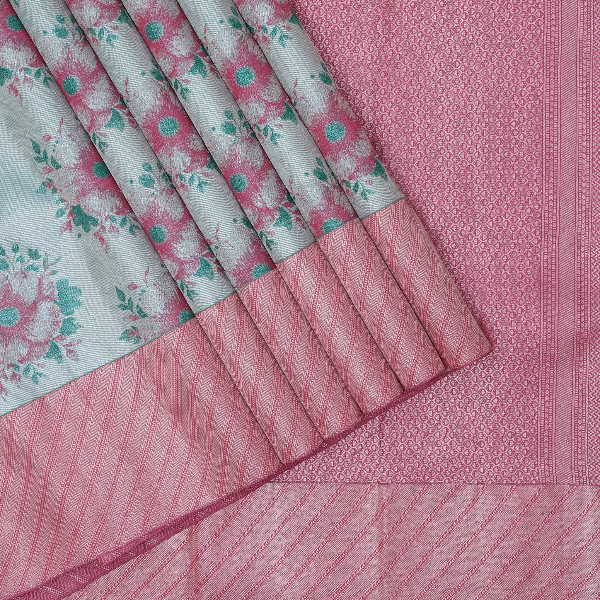 Elevate your ethnic wardrobe with this stunning tissue silk saree, a perfect blend of tradition and contemporary style. The saree features an exquisite tea green base adorned with intricate silver zari floral motifs that cascade gracefully across the fabric. The highlight is the striking pink border embellished with silver zari cross designs, adding a bold, modern touch to this classic drape. Crafted from premium tissue silk, this saree offers a lightweight, breathable comfort ideal for any occasion—from festive celebrations to formal gatherings. The lustrous sheen of the fabric combined with the detailed zari work creates an elegant, eye-catching appeal that stands out effortlessly. Perfect for those who appreciate timeless elegance with a contemporary twist, this saree is a versatile addition to your collection. Pair it with traditional jewelry or keep it minimal for a modern look. A true statement piece that celebrates craftsmanship and style.