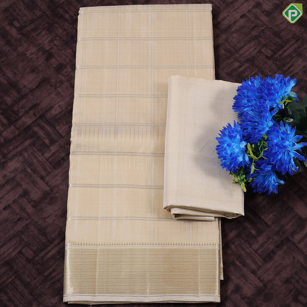 Experience timeless elegance with this exclusive 3-in-1 pure silk dhoti vesti set, crafted in rich sandal gold with intricate vairaoosi zari kattam checks. The self border design showcases traditional weaving techniques, while the premium silk fabric ensures superior comfort and durability. Perfect for weddings, festivals, and special occasions, this versatile set combines authentic craftsmanship with sophisticated styling. The pure silk composition provides a luxurious drape and natural sheen that elevates any formal ensemble.