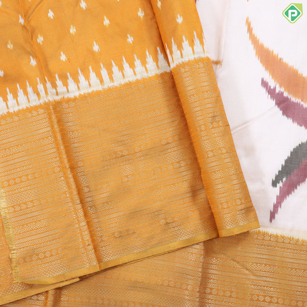 Cream white multicolor flying twitter ikkat design Mustard yellow gold zari multi lines border ikkat silk saree