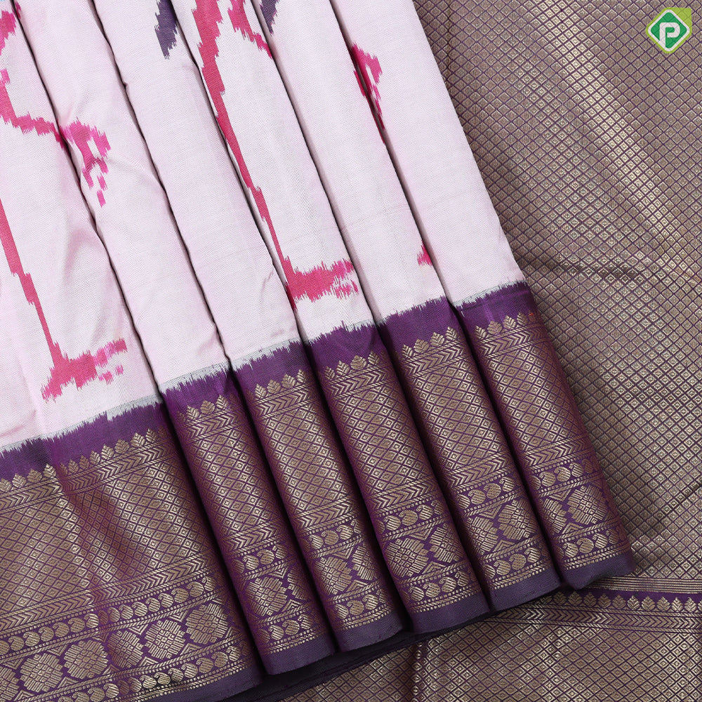 Powder Pink multi color Flamingo ikkat design Violet gold zari diamond butta border ikkat silk saree