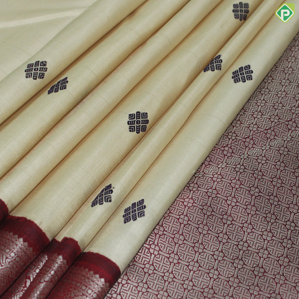 Cream Color Flower Motif With Red Color Peacock Design Border Thread Work Silk Saree