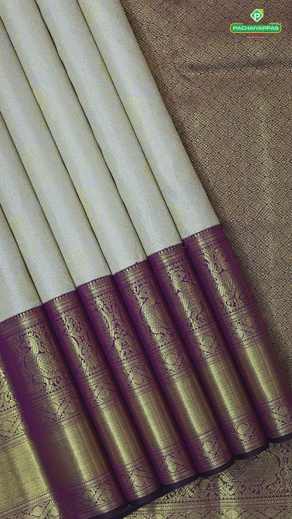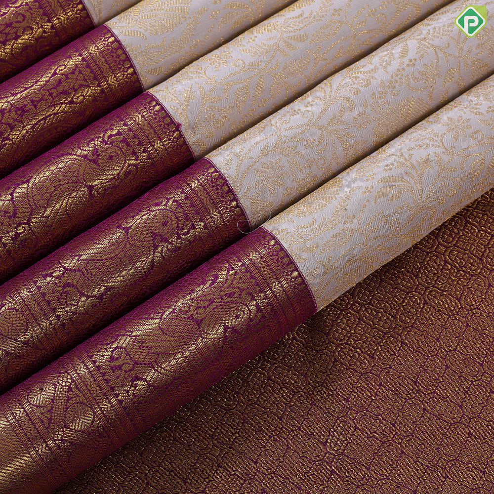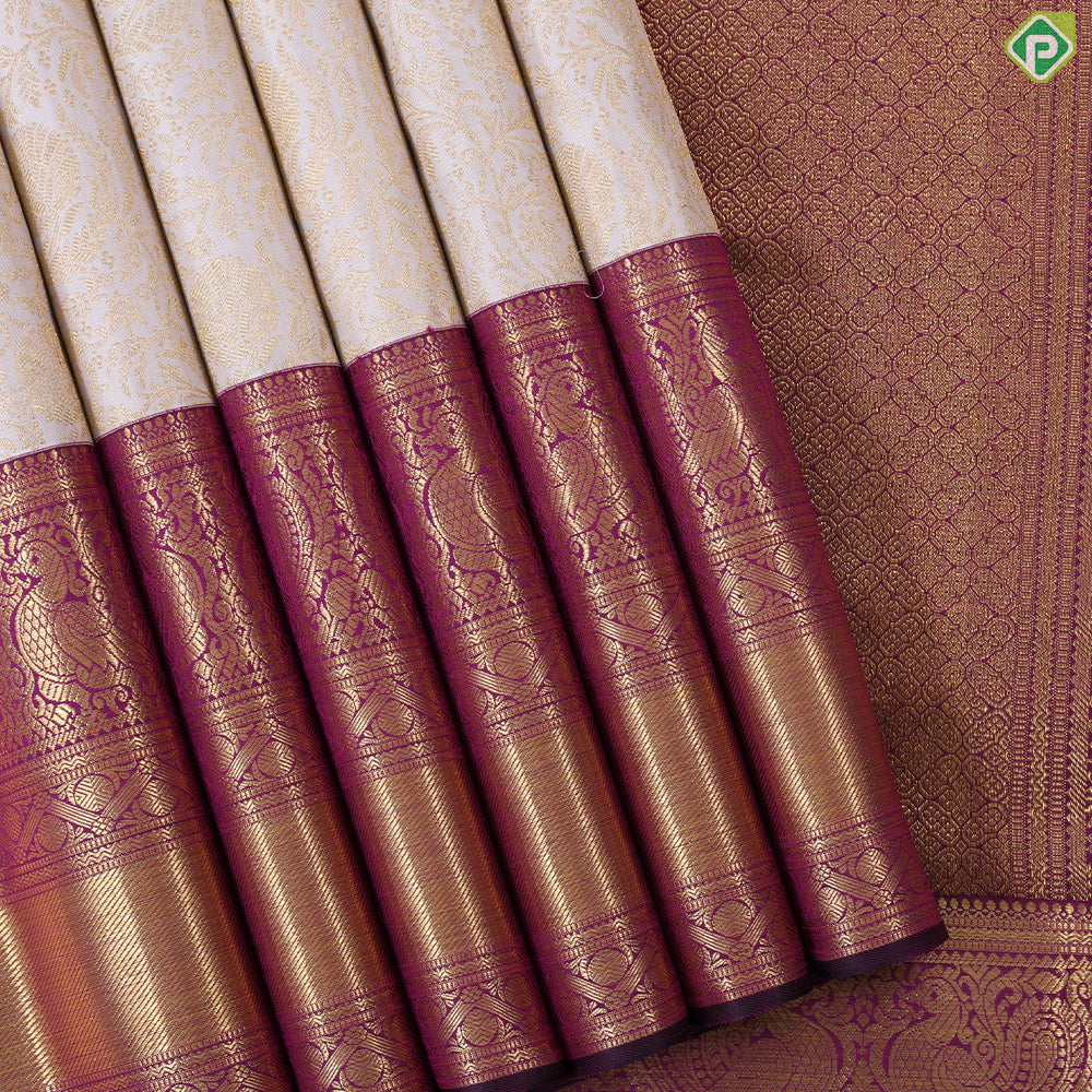 This exclusive bridal silk saree features a cream white base adorned with an intricate gold zari grand floral full-body design, exuding timeless elegance. The contrasting violet border enhances its beauty with delicate gold zari peacock buttas, complemented by a distinctive double gap border. Perfect for special occasions, this saree combines traditional craftsmanship with luxurious materials to create a stunning statement piece.