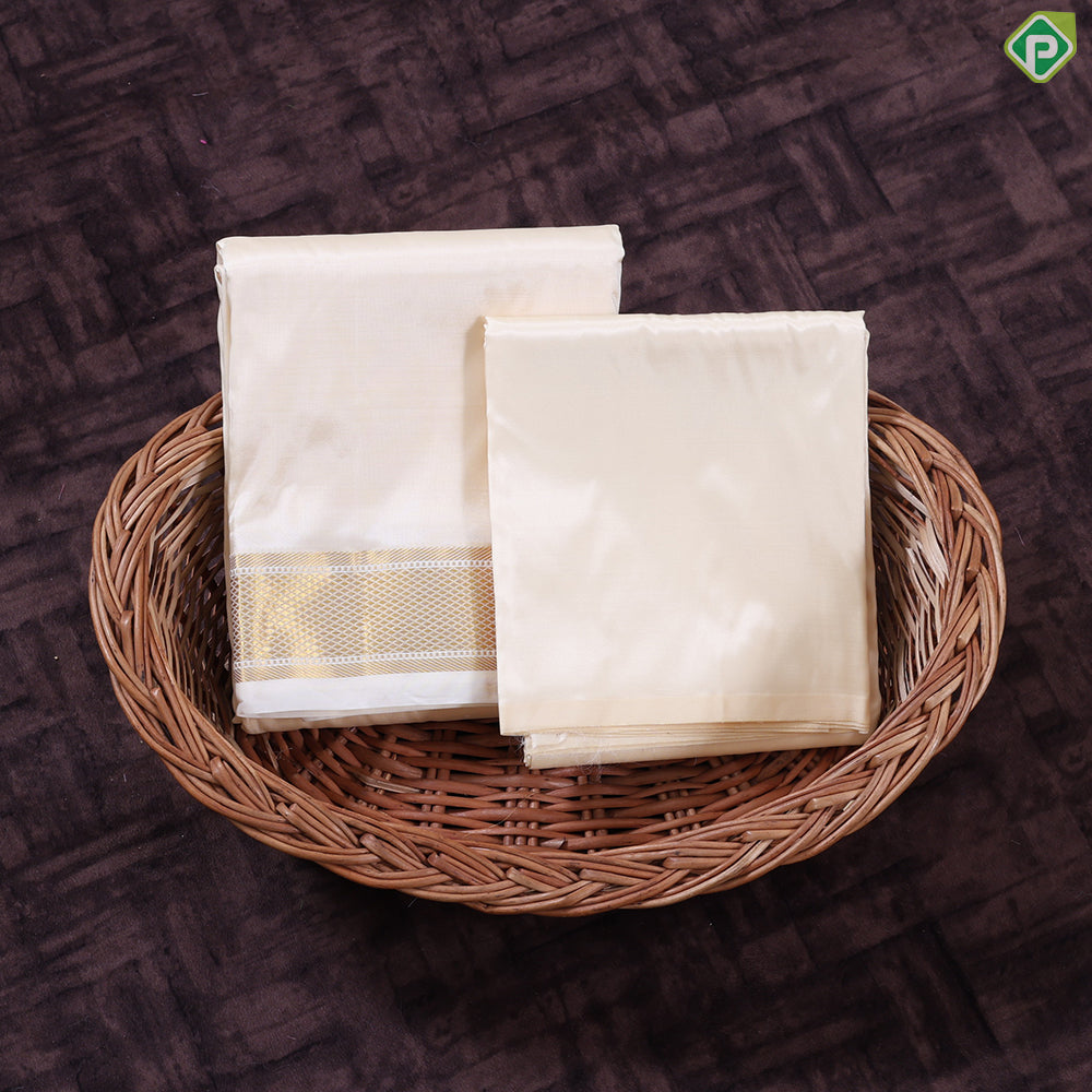 Creamy Sandal Gold Zari Mayilkan Border 2 in 1 Pure Mix Silk 8 Muzham Dhothi Set