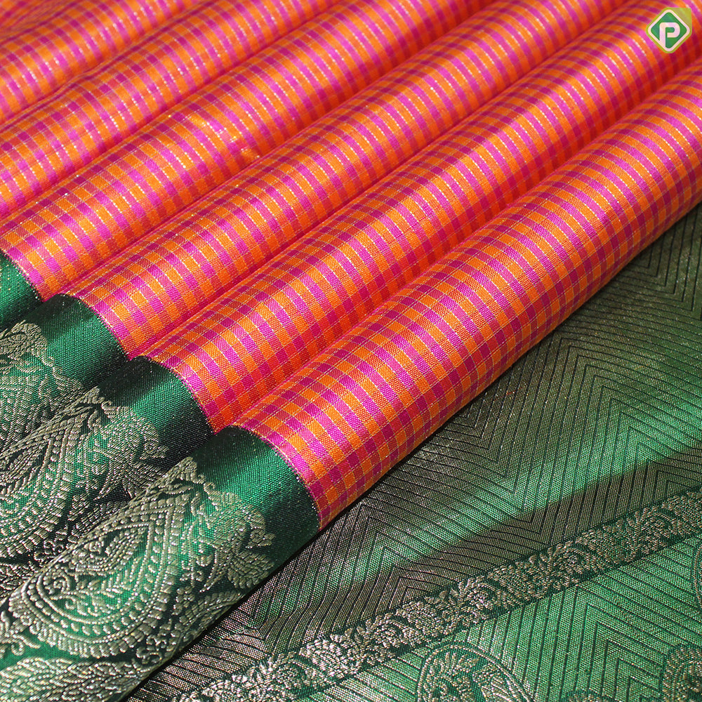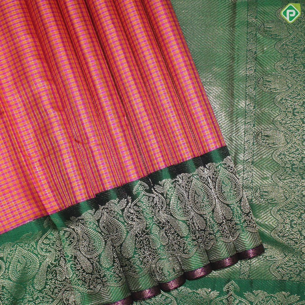 Fanta Orange And Pink Color Checked Gold Zari With Green Color Peacock Design Border Traditional Silk Saree