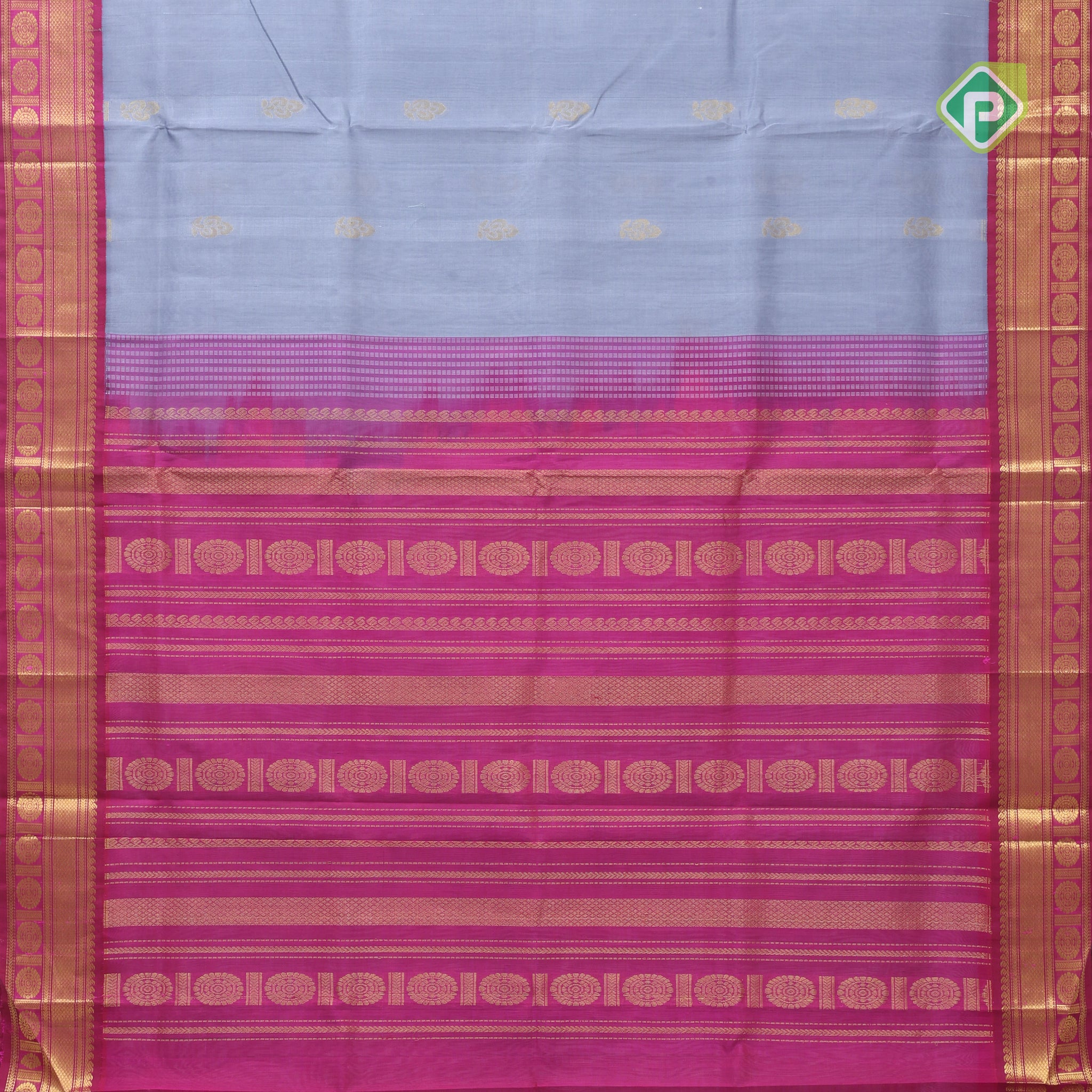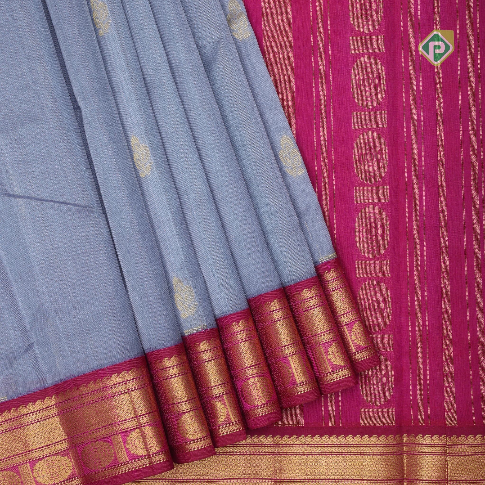 Grey gold zari fancy flower butta rich pallu design Rani pink gold zari border silk cotton saree
