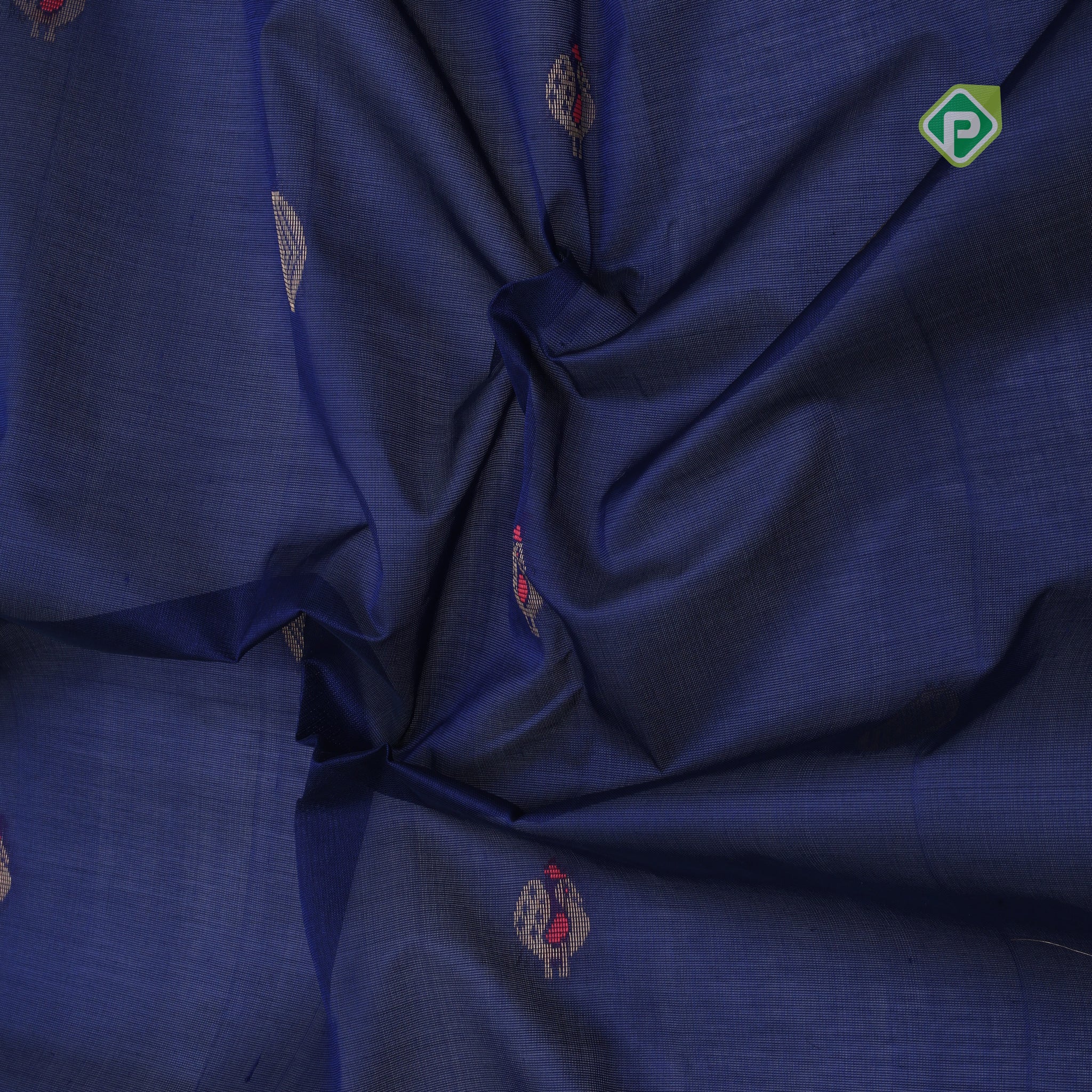 Elegant indigo blue kuppadam silk cotton saree adorned with intricate zari butta and meena work. Features a striking rama green gold zari border that adds a regal touch. The blend of silk and cotton ensures comfort and breathability, making it perfect for both festive occasions and everyday wear. The traditional kuppadam weave combined with detailed embellishments creates a timeless piece that celebrates classic South Indian craftsmanship. Ideal for weddings, celebrations, and special gatherings.
