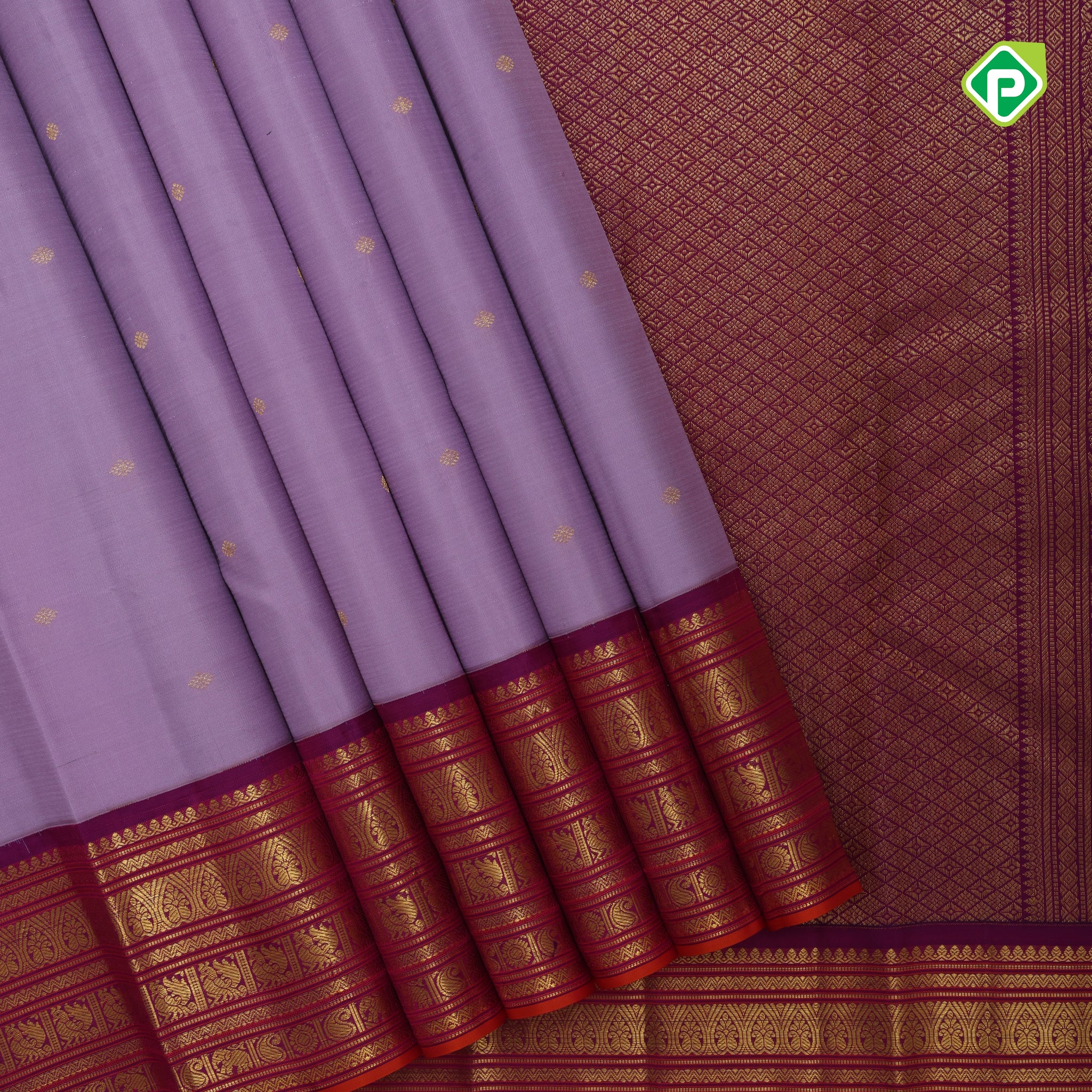 Lavender gold zari rudraksham butta design contrast purple gold zari three line butta border traditional silk saree