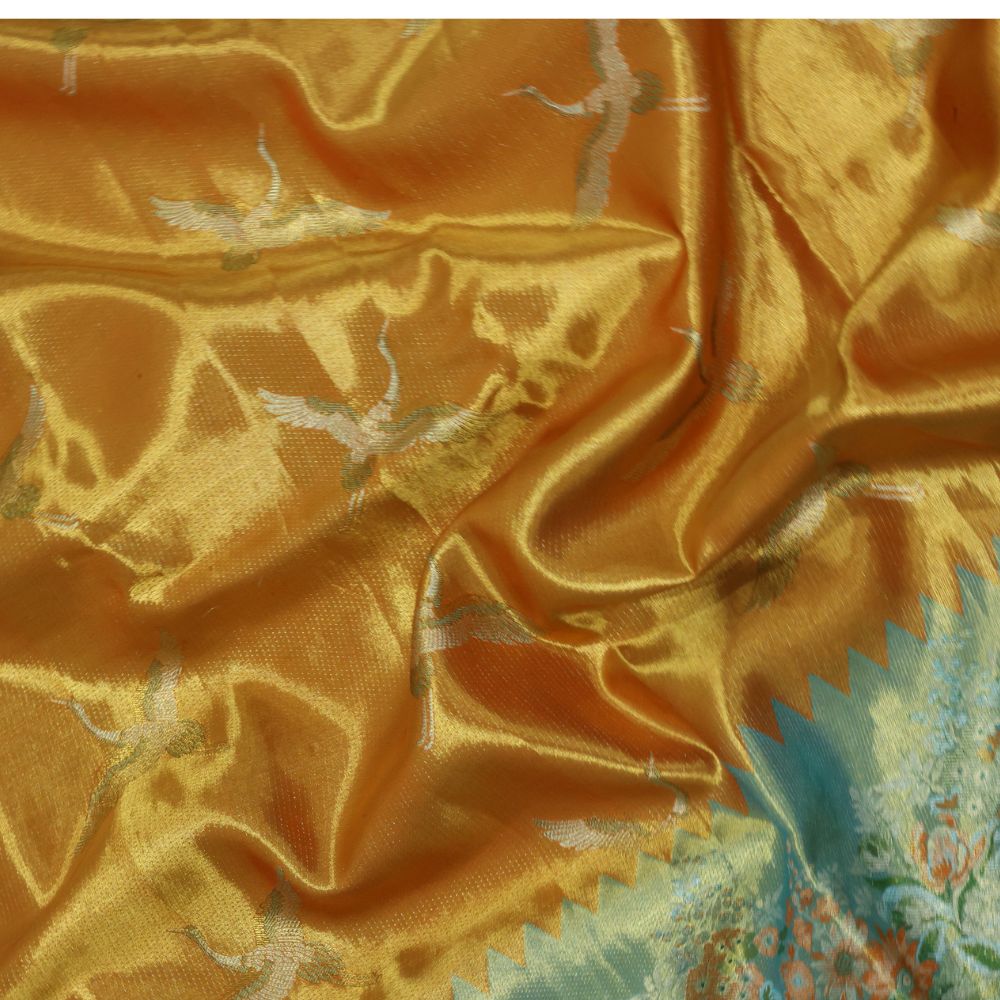 Orange silver zari swan meena work contrast green jaamthani border bridal tissue silk saree