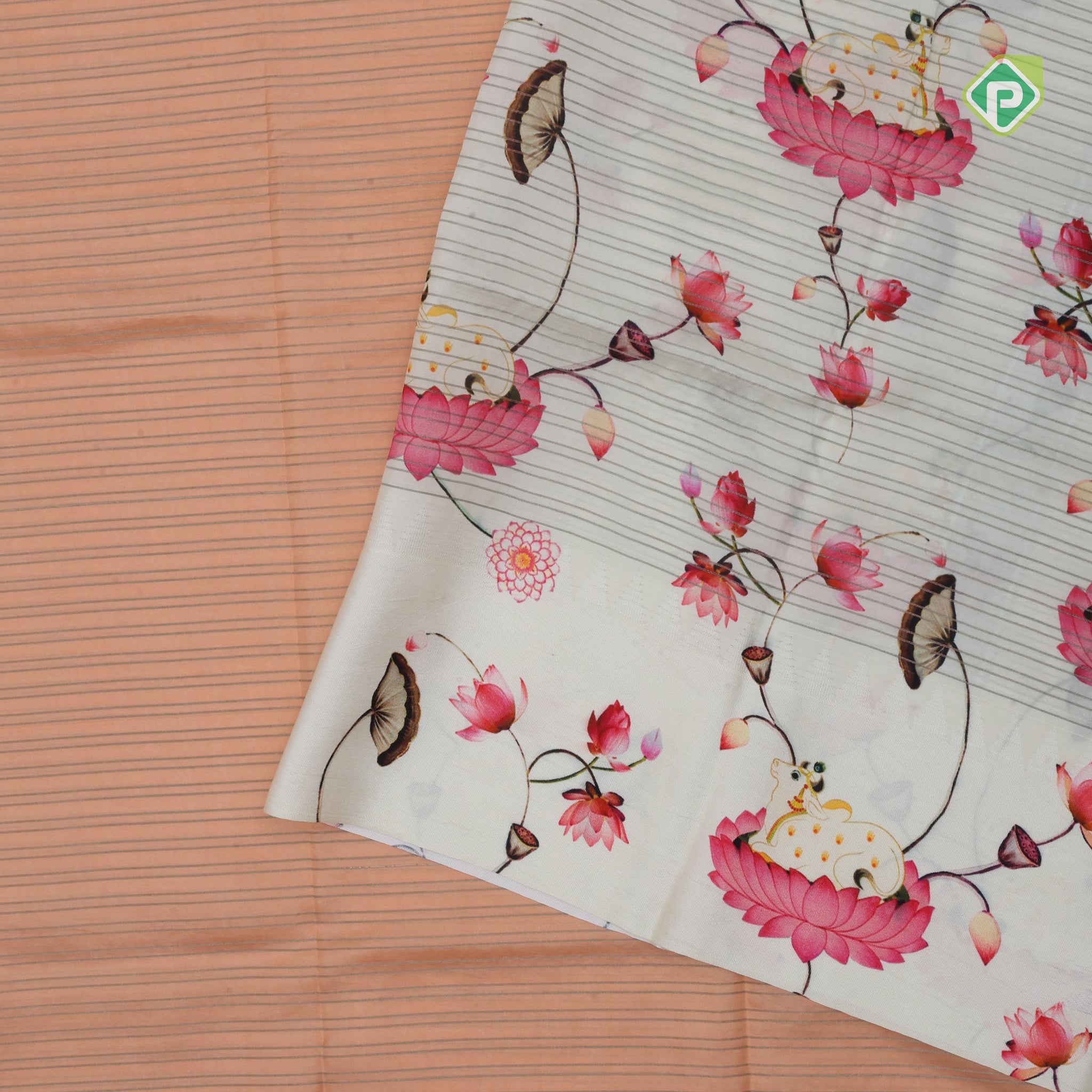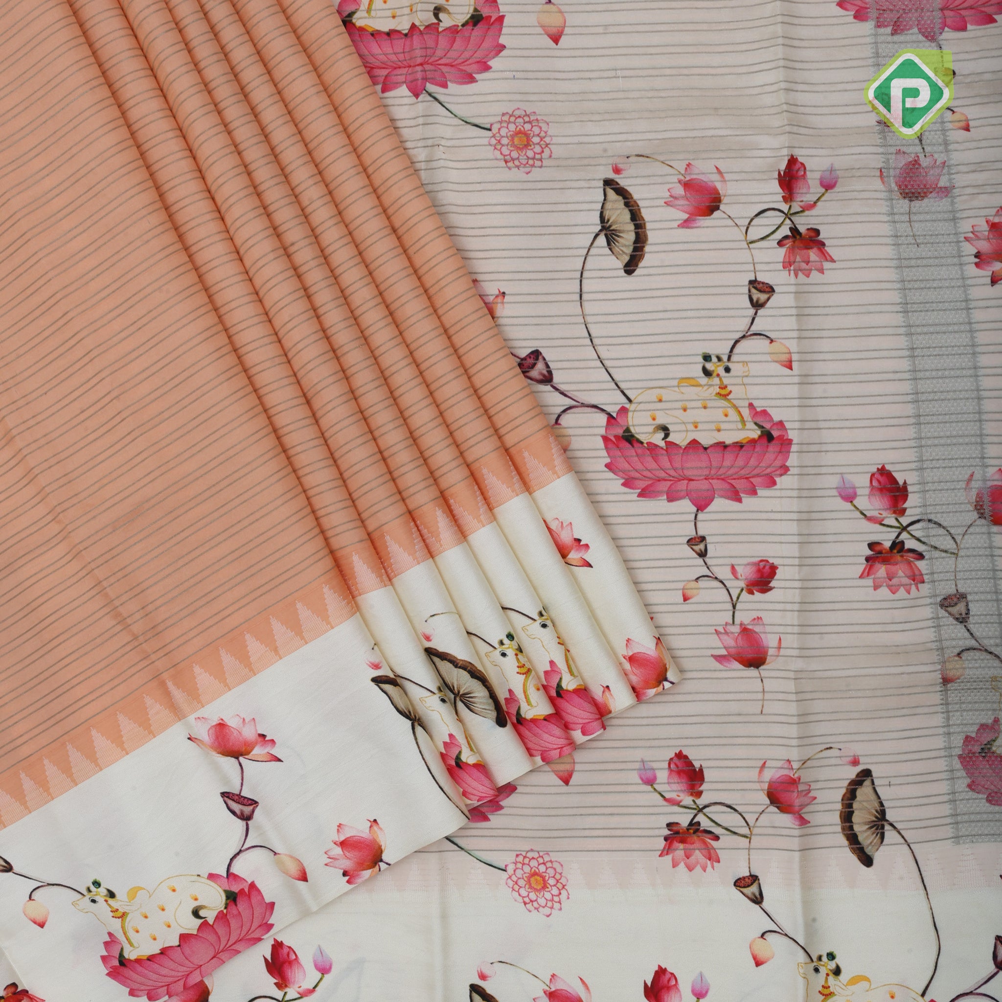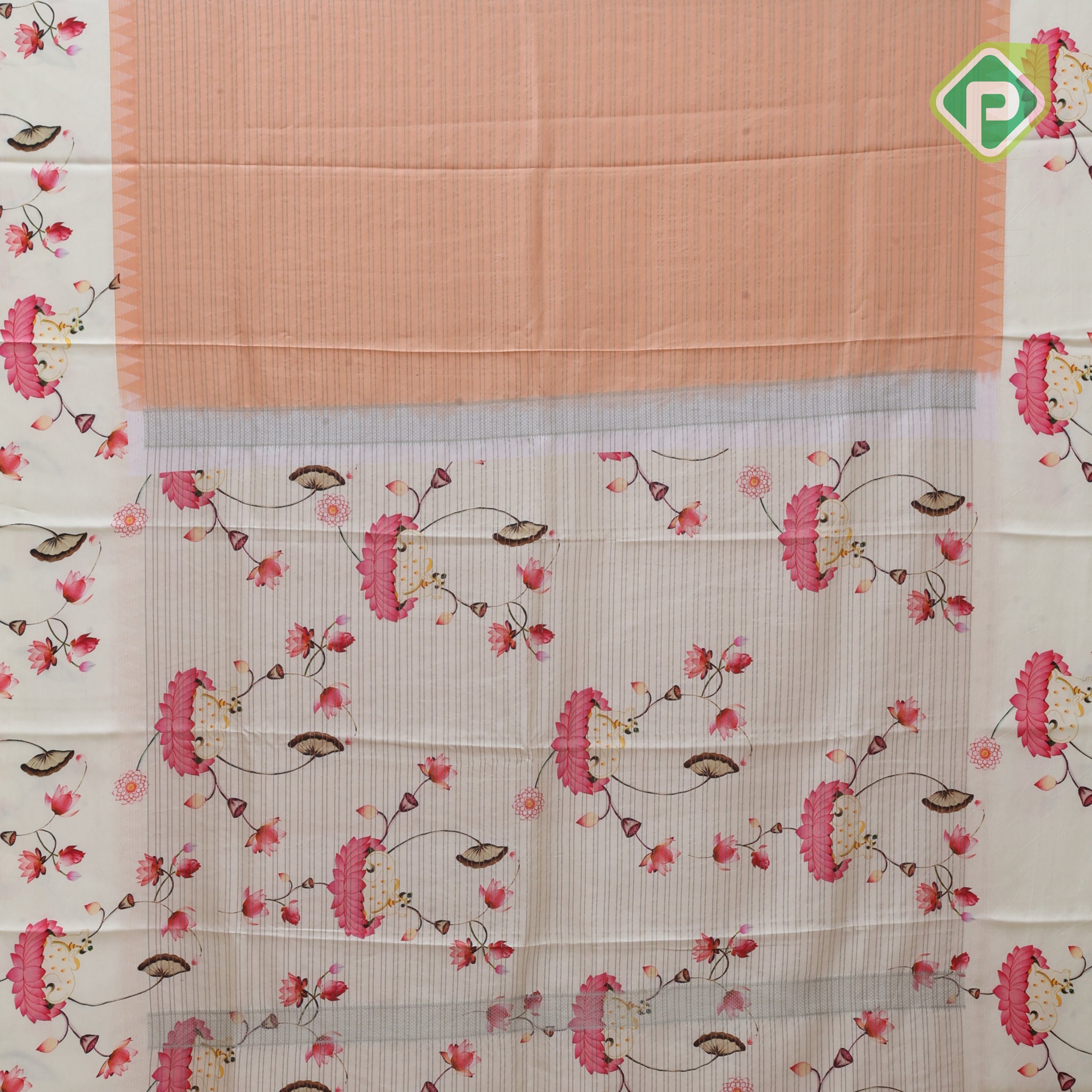 Peach pink gold zari vairaoosi lines contrast cream white floral digital print border silk saree