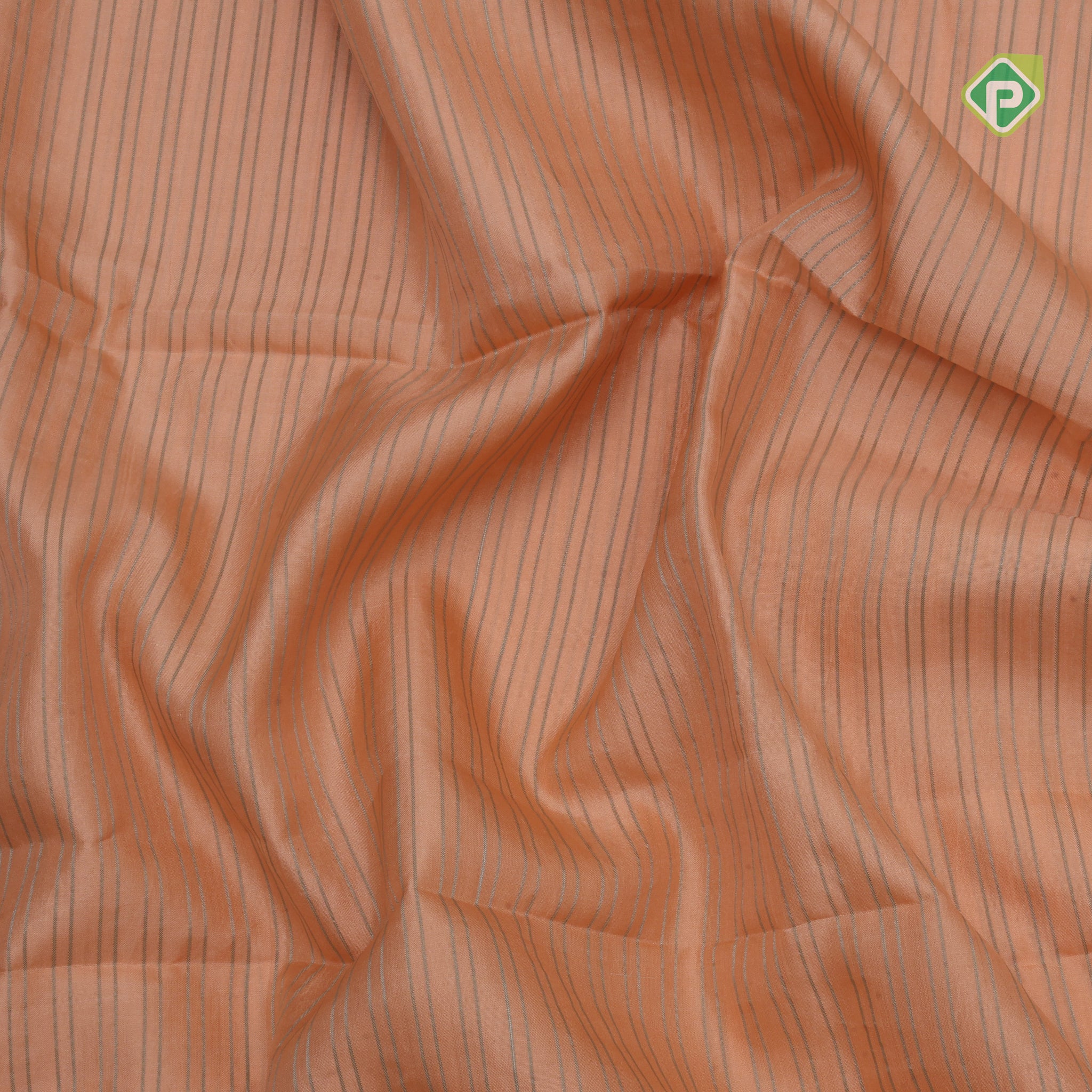 Elegant peach pink silk saree adorned with intricate gold zari vairaoosi lines that create a sophisticated geometric pattern. The saree features a stunning contrast cream white floral digital print border, adding a contemporary touch to this traditional piece. The delicate interplay of warm peachy tones with cool cream accents makes this saree perfect for festive occasions and celebrations. Crafted from premium silk, it drapes beautifully and offers comfort throughout the day. An ideal choice for those seeking a blend of classic elegance and modern design sensibilities.