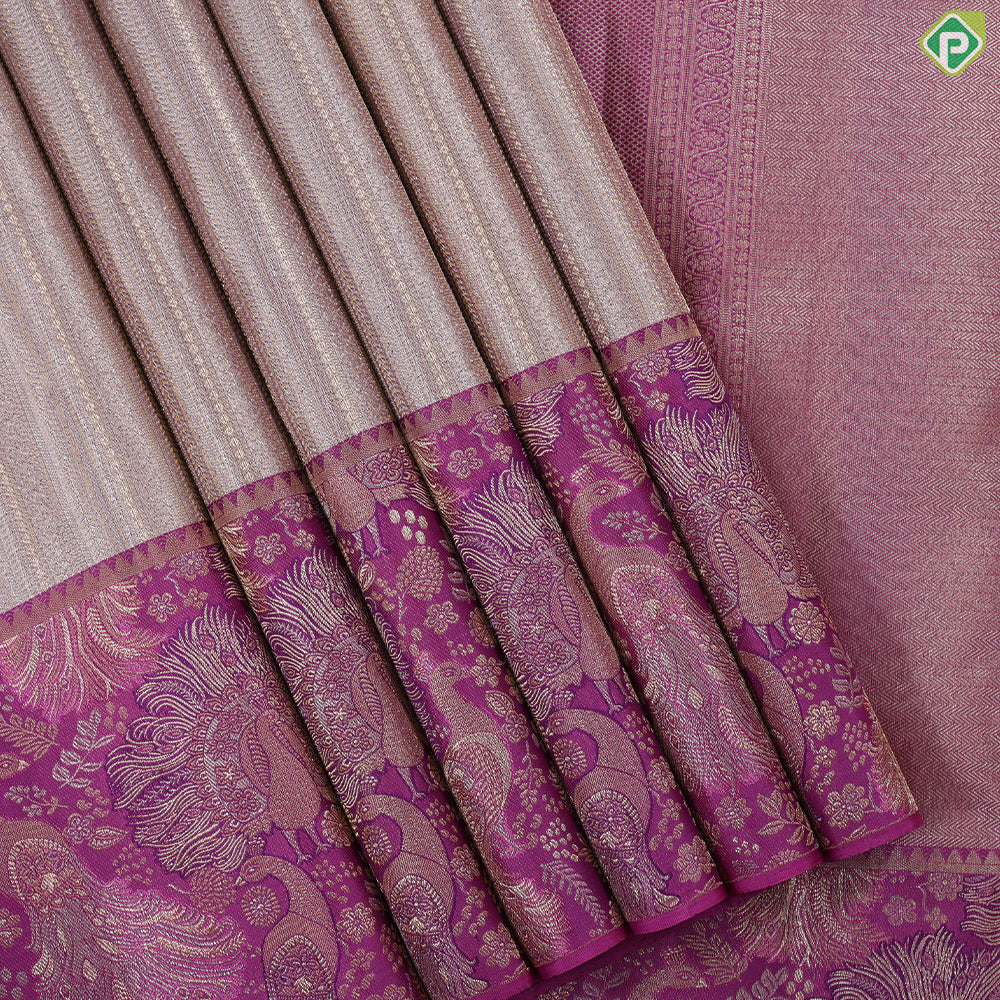 Peach silver gold zari self weaved stripes design rani pink silver gold zari peacock dancing border trendy silk saree