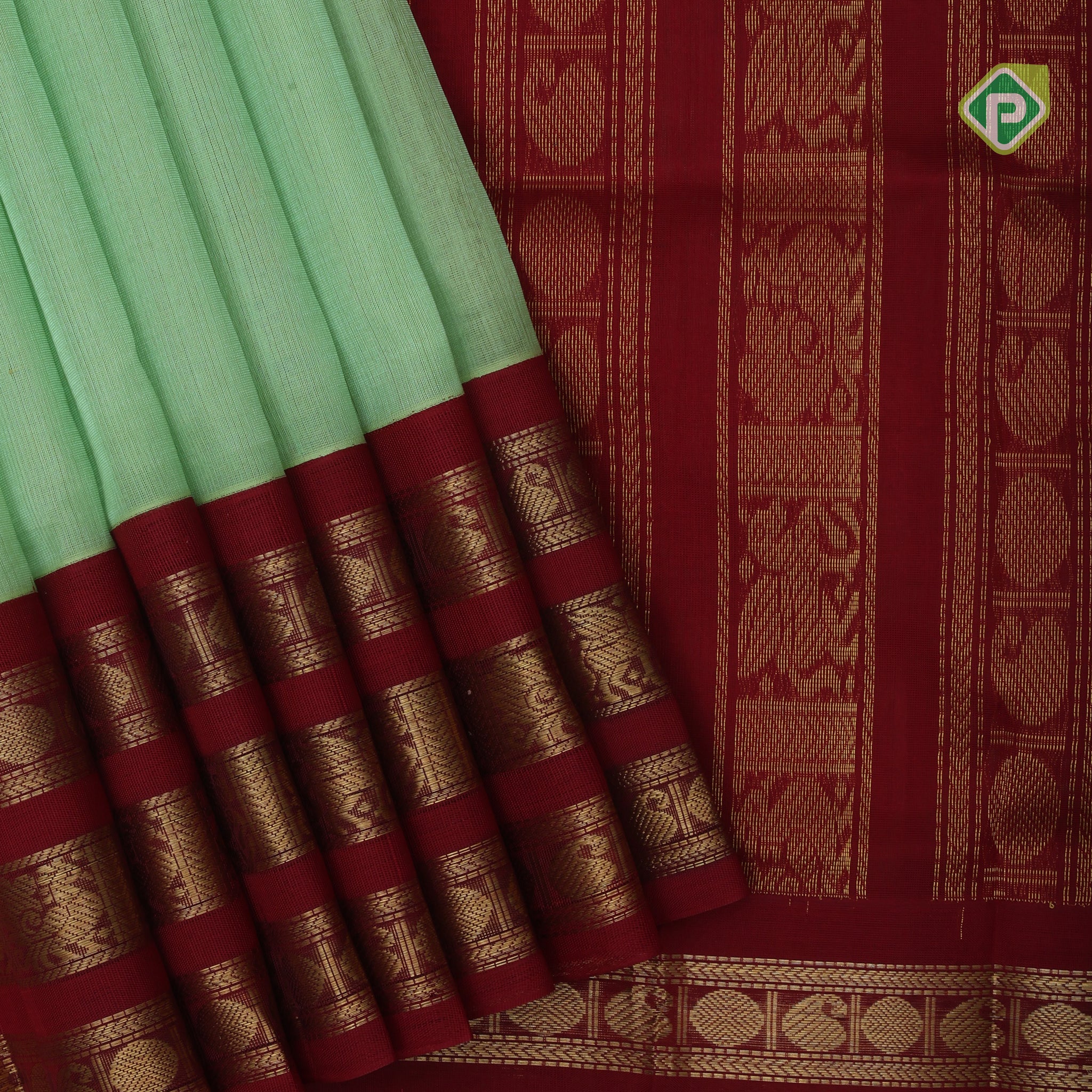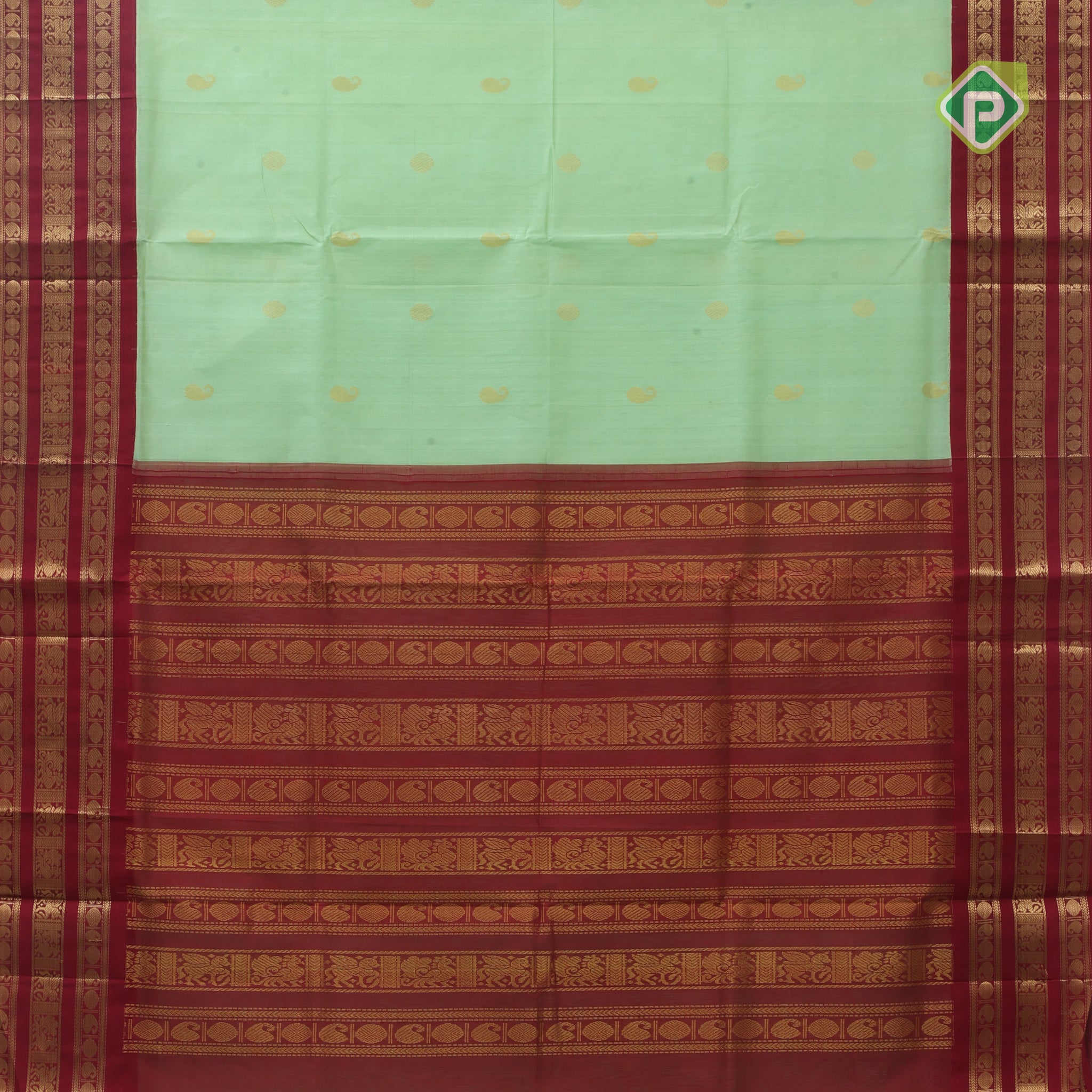Pista green butta design red grand pallu concept rani red gold zari border silk cotton saree