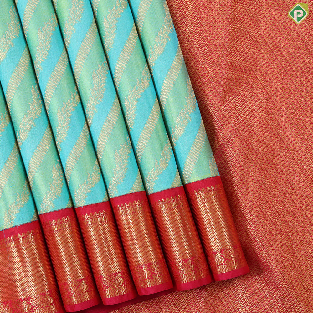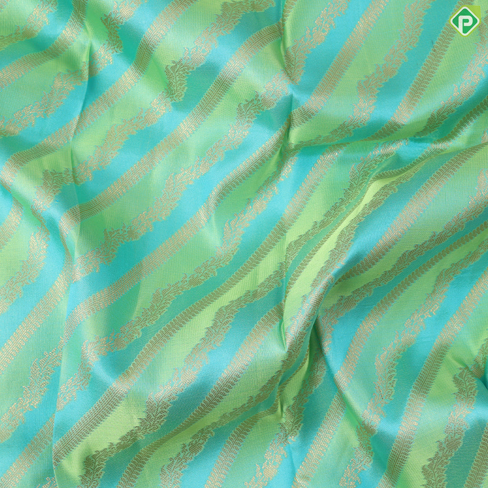 Pista green sky blue and gold zari cross lines design contrast pink gold zari border grand bridal silk saree