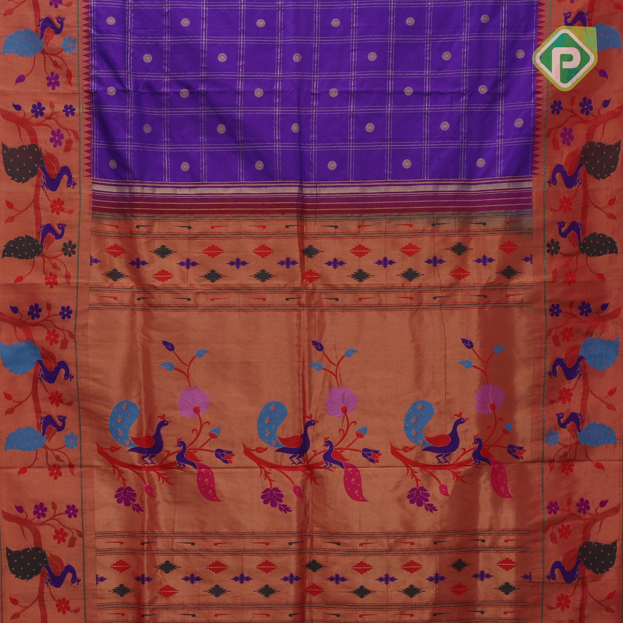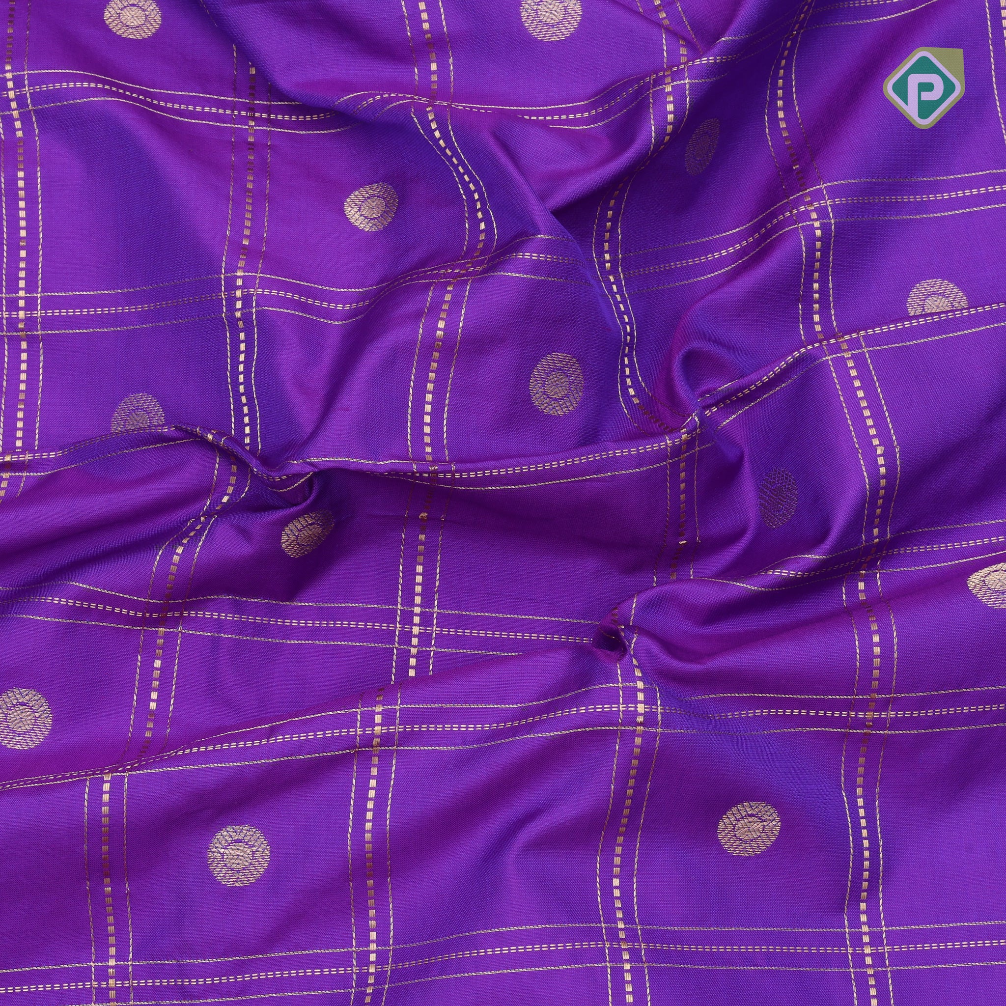 | Body design | purple blue gold zari double check flower butta design |