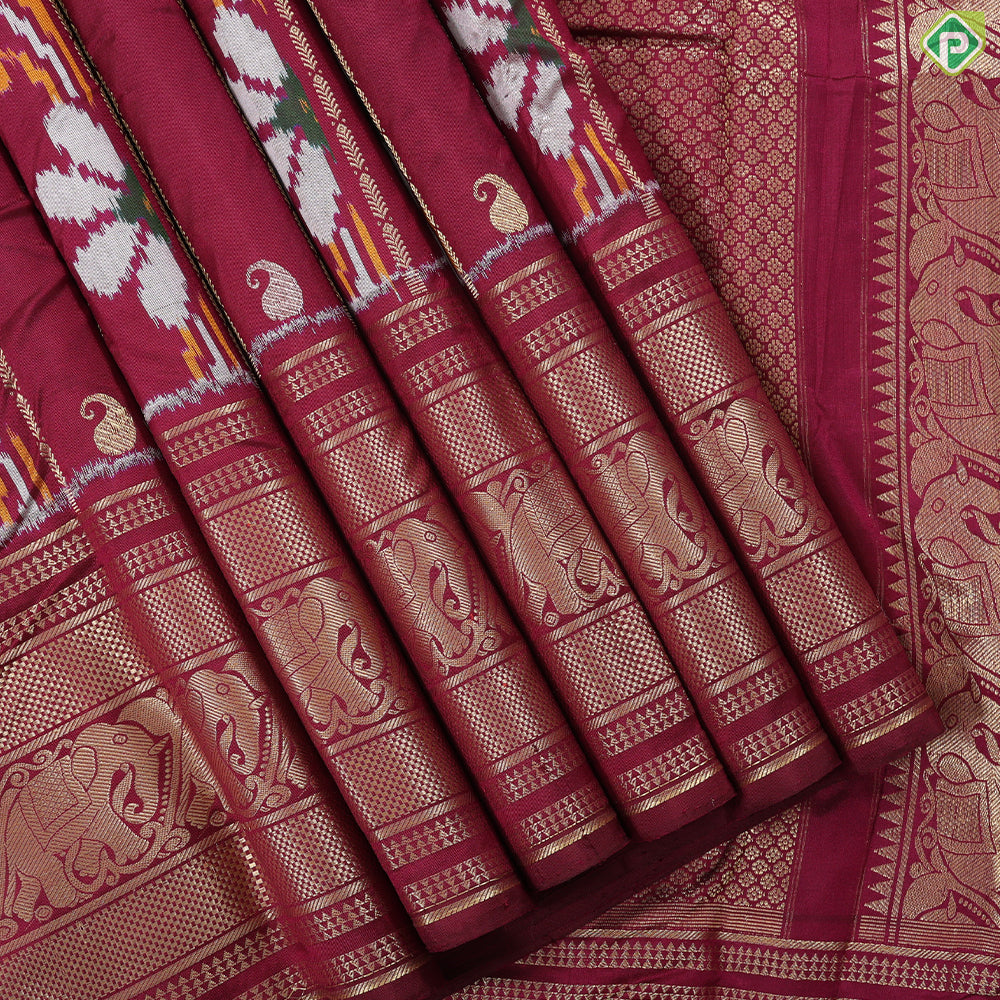 Elevate your collection with this exquisite rani pink silk saree, a masterpiece of traditional craftsmanship. The body features an intricate ikat design with mango and stripe motifs, complemented by lustrous gold zari detailing throughout. The self-patterned peacock butta border, rendered in gold zari, adds regal sophistication and movement. Hand-woven using time-honored ikat techniques, this saree seamlessly blends heritage artistry with contemporary elegance, making it an ideal choice for festive occasions, celebrations, and formal gatherings.