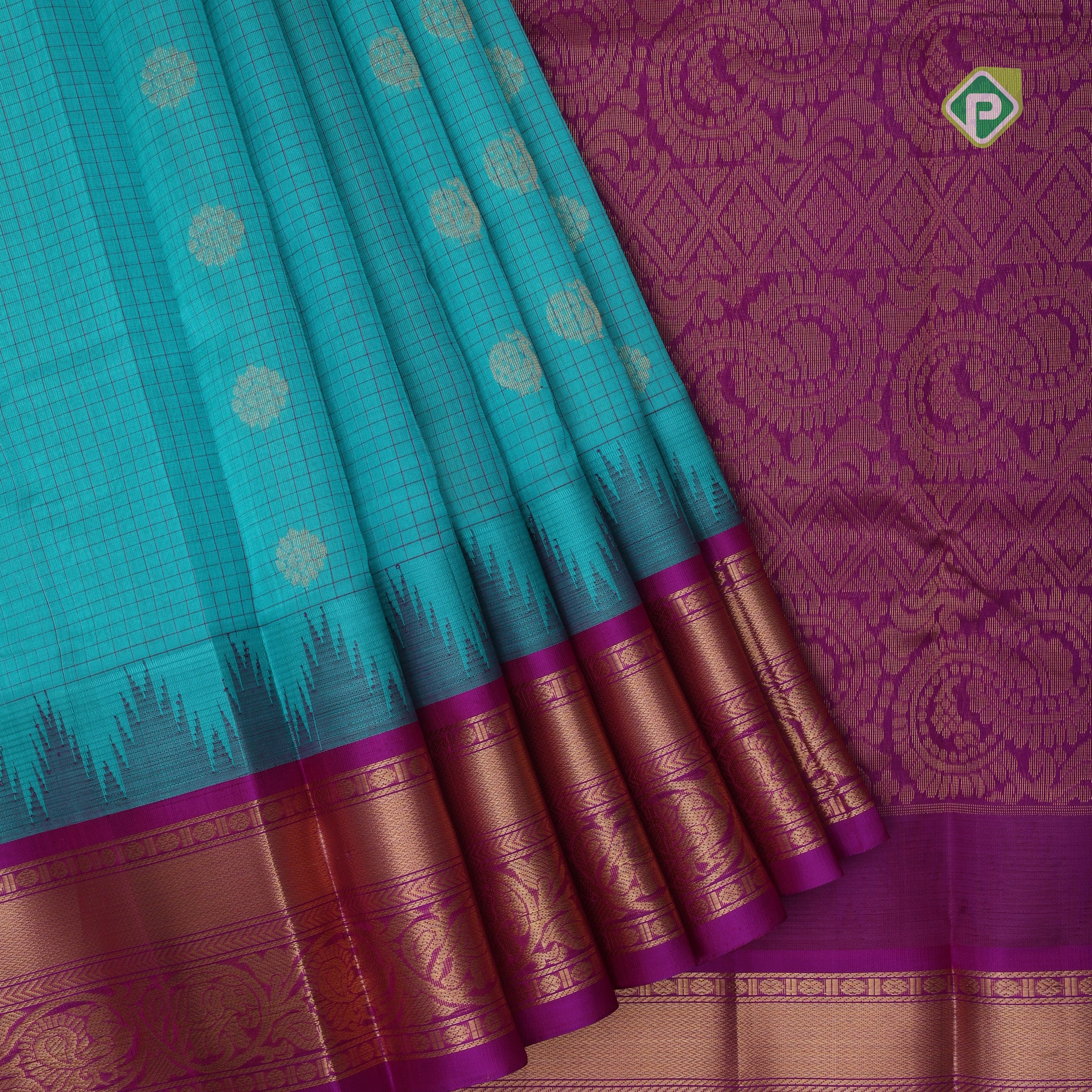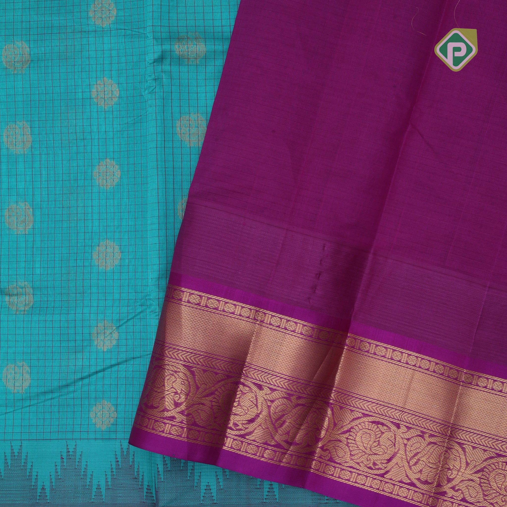 Sea green gold zari mayil rudraksham butta checked grand pallu design contrast border silk cotton saree