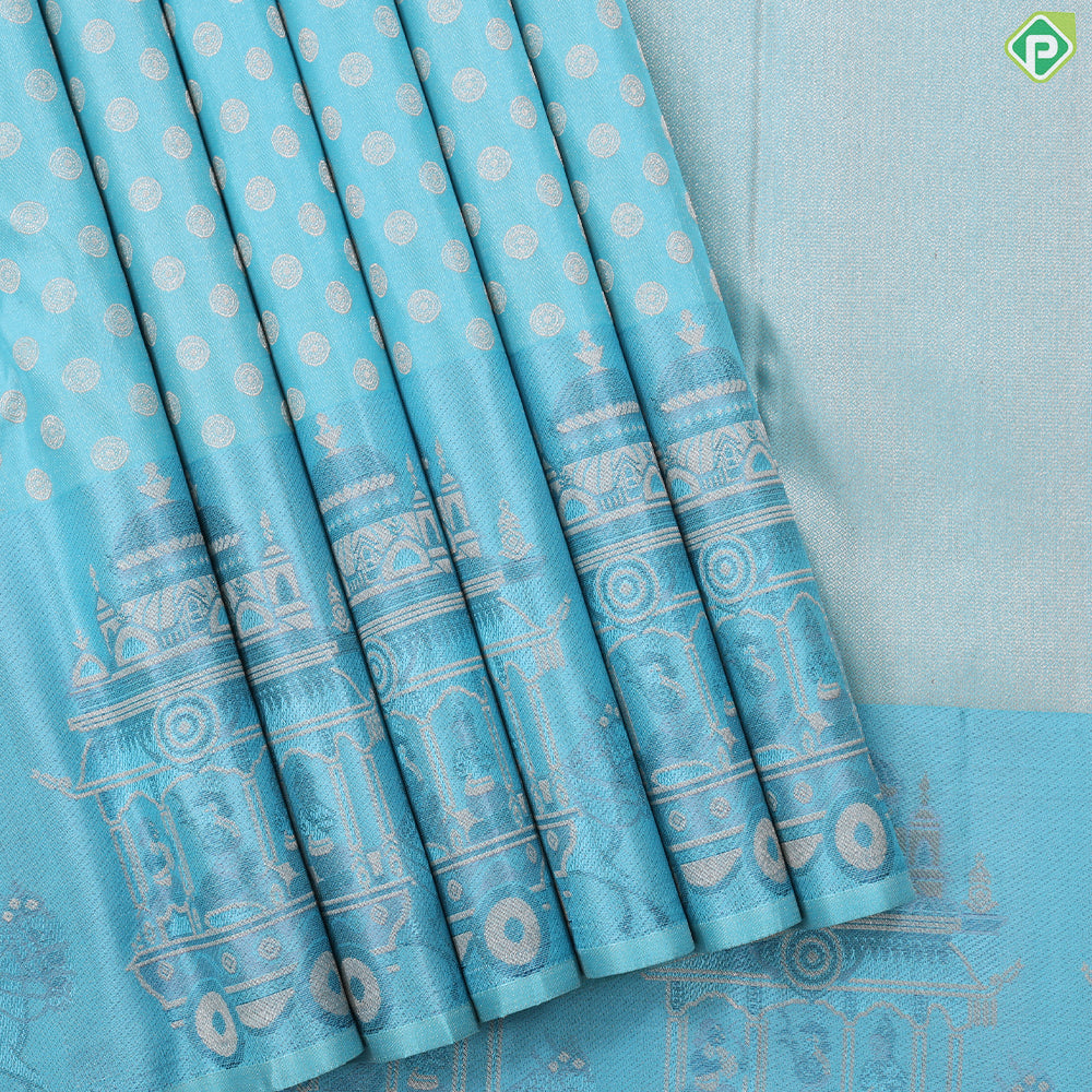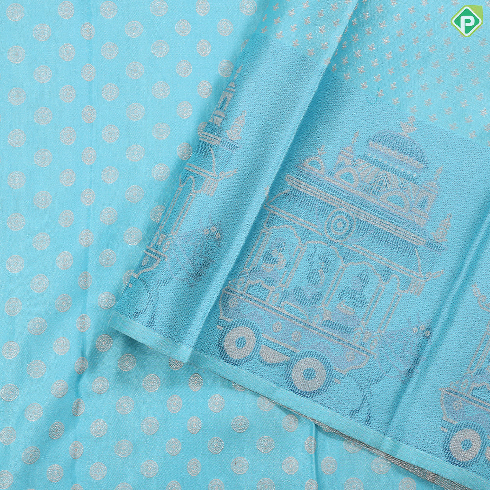 Sky Blue silver gold zari double layer round butta design Couples in Chariot posture Border Trendy silk saree