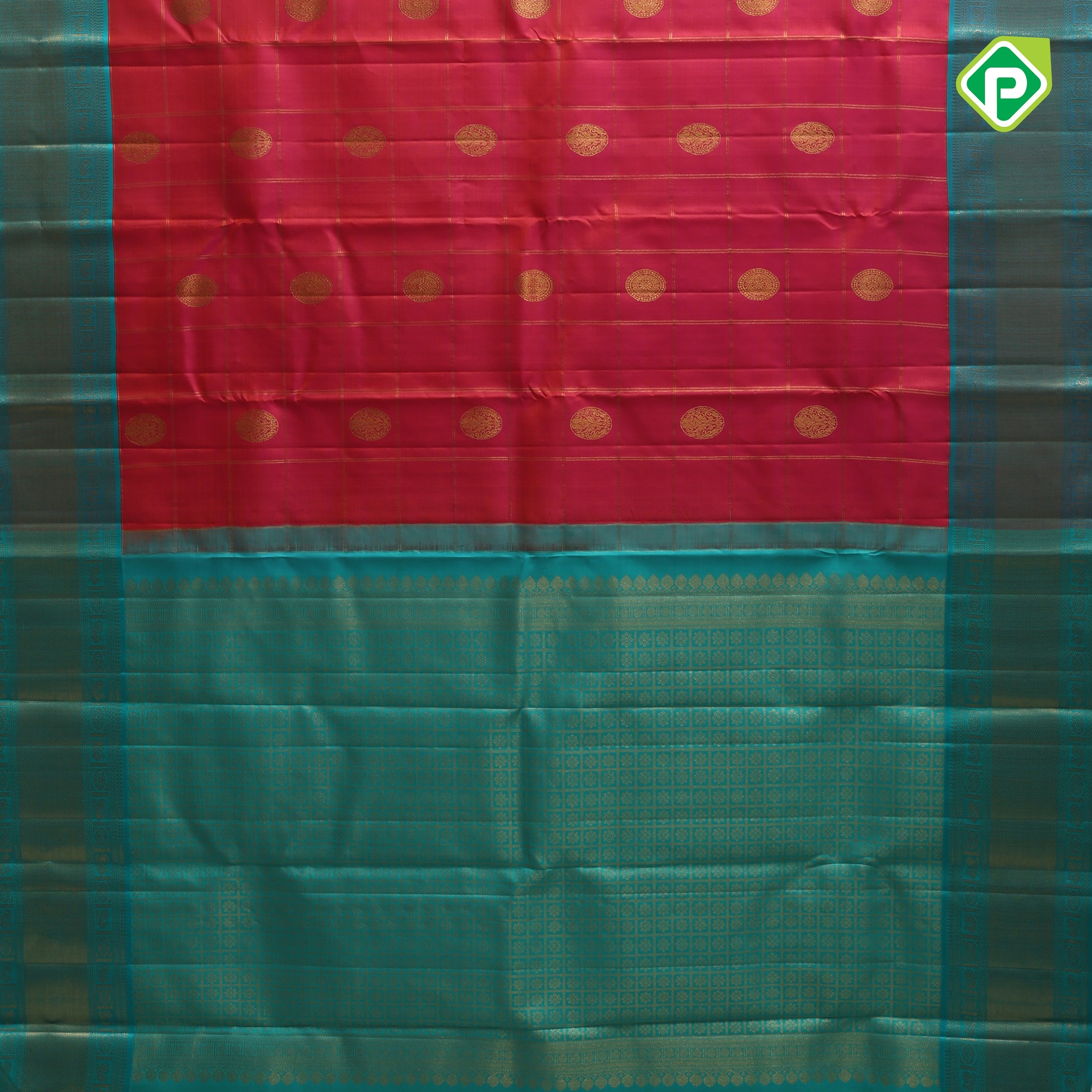 tomato red gold zari checked self design round butta contrast rexona green gold zari border traditional silk saree