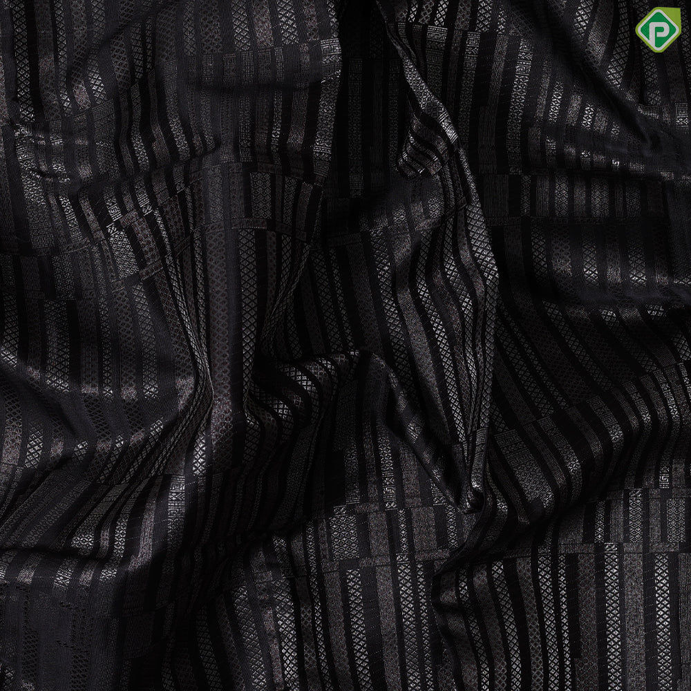 This exquisite silk saree showcases a walnut brown base adorned with elegant silver zari geometric lines, creating a striking contemporary pattern. Its contrasting rose pink border features finely woven silver zari multi-lines, adding a sophisticated and trendy touch. Perfectly blending traditional craftsmanship with modern design, this designer saree offers a refined look ideal for special occasions and celebrations.
