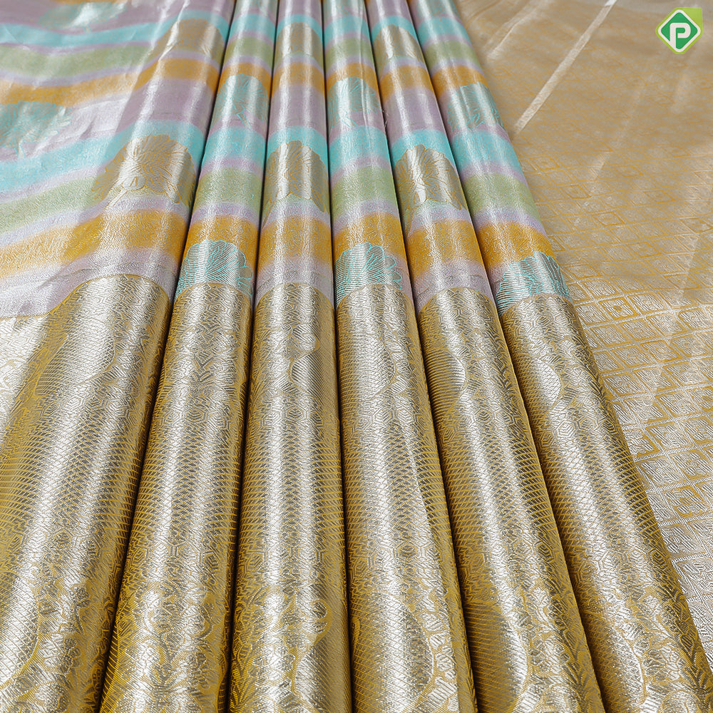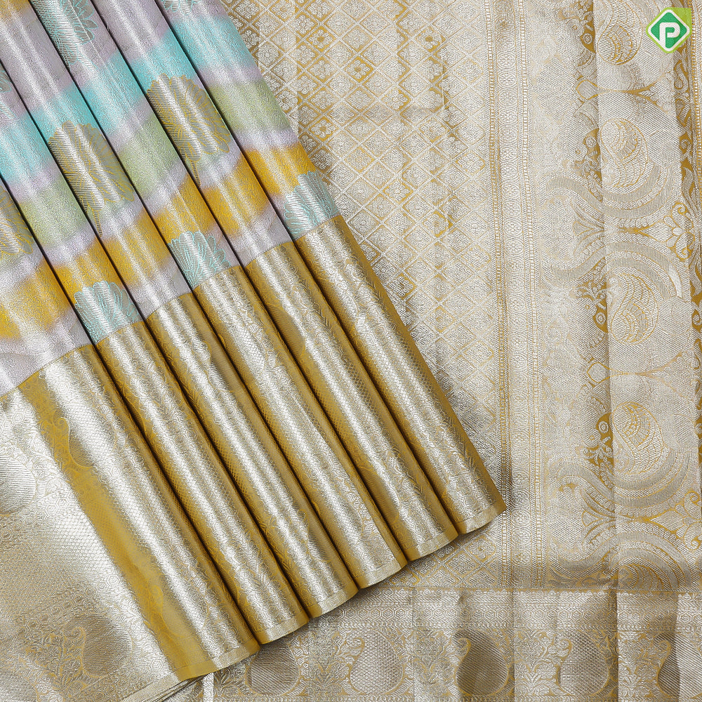 This exquisite tissue silk saree features a soothing lavender base adorned with intricate multi-colour sea shore waves and floral motifs, showcasing expert craftsmanship. The golden yellow and silver zari mango two-line mid-gap border adds a refined contrast, enhancing its prismatic luminescence. Designed as a Christmas edition, this saree blends traditional artistry with festive elegance, making it an ideal choice for special occasions and celebrations.