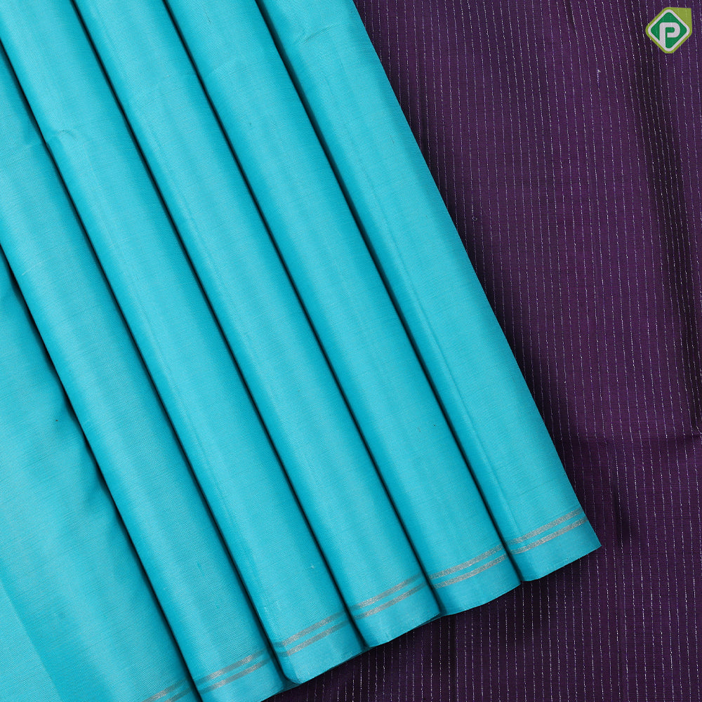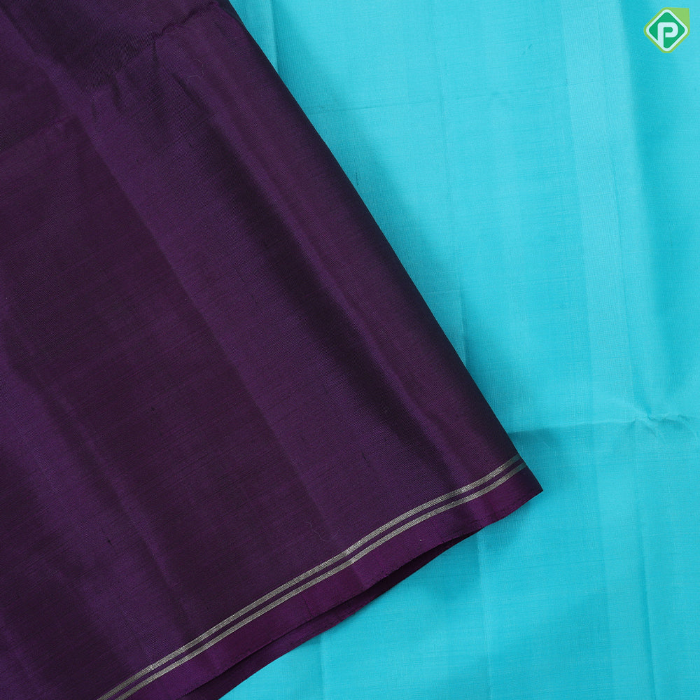 This Rama Blue soft silk saree features a full-body plain weave highlighted by subtle self-color gold zari accents. The elegant small two-line border in gold zari offers refined contrast, complemented beautifully by a silver zari pallu that adds a sophisticated touch. Perfect for formal occasions, this saree combines understated charm with expert craftsmanship for a timeless appeal.