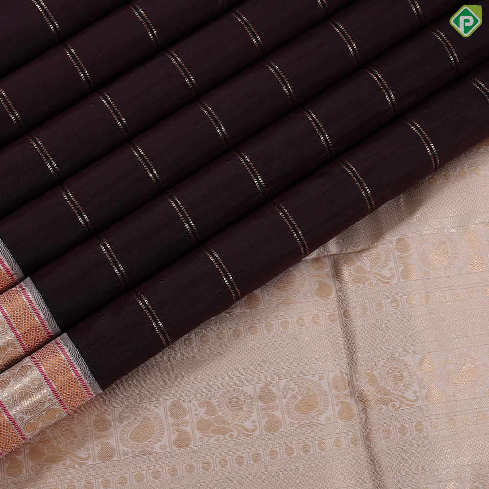 Elevate your saree collection with this exquisite traditional silk saree, a masterpiece of classic South Indian weaving. The rich dates brown base features delicate gold zari vairaoosi lines that create intricate geometric patterns, while a striking cream contrast section adds sophisticated dimension. The multi-color gold zari border showcases meticulous craftsmanship, blending warm metallics with complementary hues for a regal finish. Woven from premium silk, this saree drapes beautifully and suits both festive occasions and cultural celebrations. Perfect for those who appreciate heritage textiles and timeless elegance.