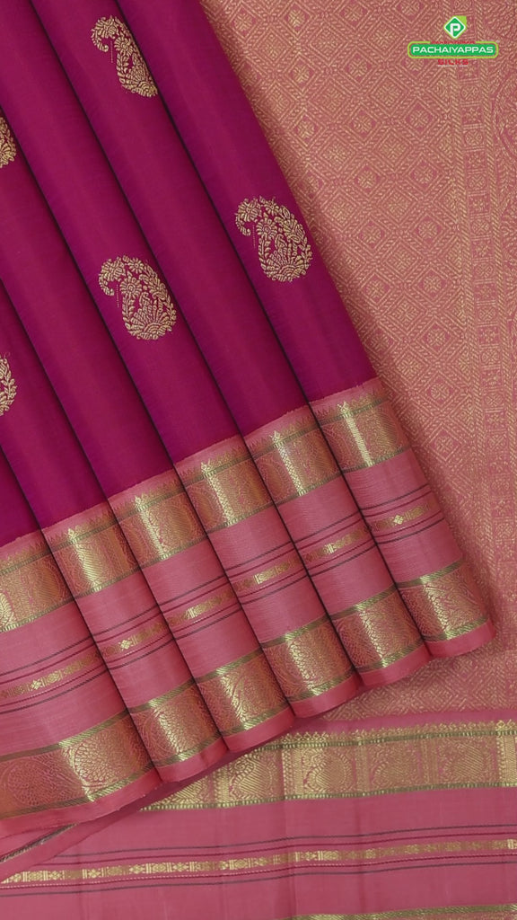 Rani pink gold zari mango butta motifs peach with gold zari silk thread lines border traditional silk saree