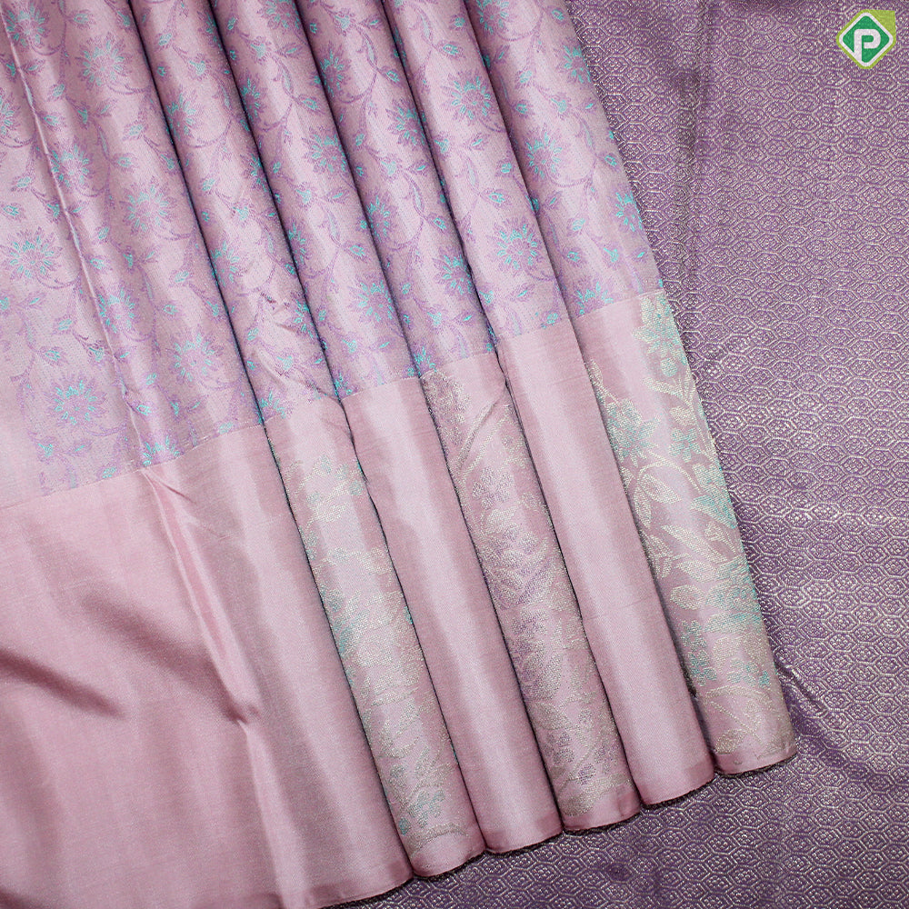 Peach Pink Flower Punch Thread work Design Gold Zari With Self Color Border Trendy Silk Saree