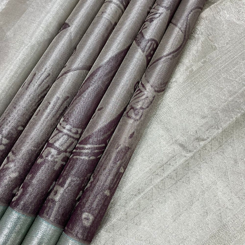This elegant silk saree features a sophisticated silver grey base adorned with intricate coffee brown horse and elephant motifs, showcasing exquisite craftsmanship. The sea green border is enhanced with silver and gold zari work, displaying delicate rangoli patterns and cross lines that add a contemporary touch. Perfect for festive occasions and formal events, this designer saree combines traditional artistry with modern style, offering a graceful and refined look.