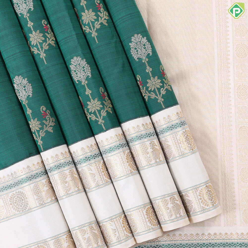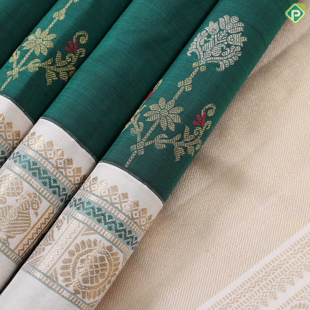 Bottle Green Gold Zari Big Flower Butta Design Contrast Cream White Rettapet Border Traditional Silk saree