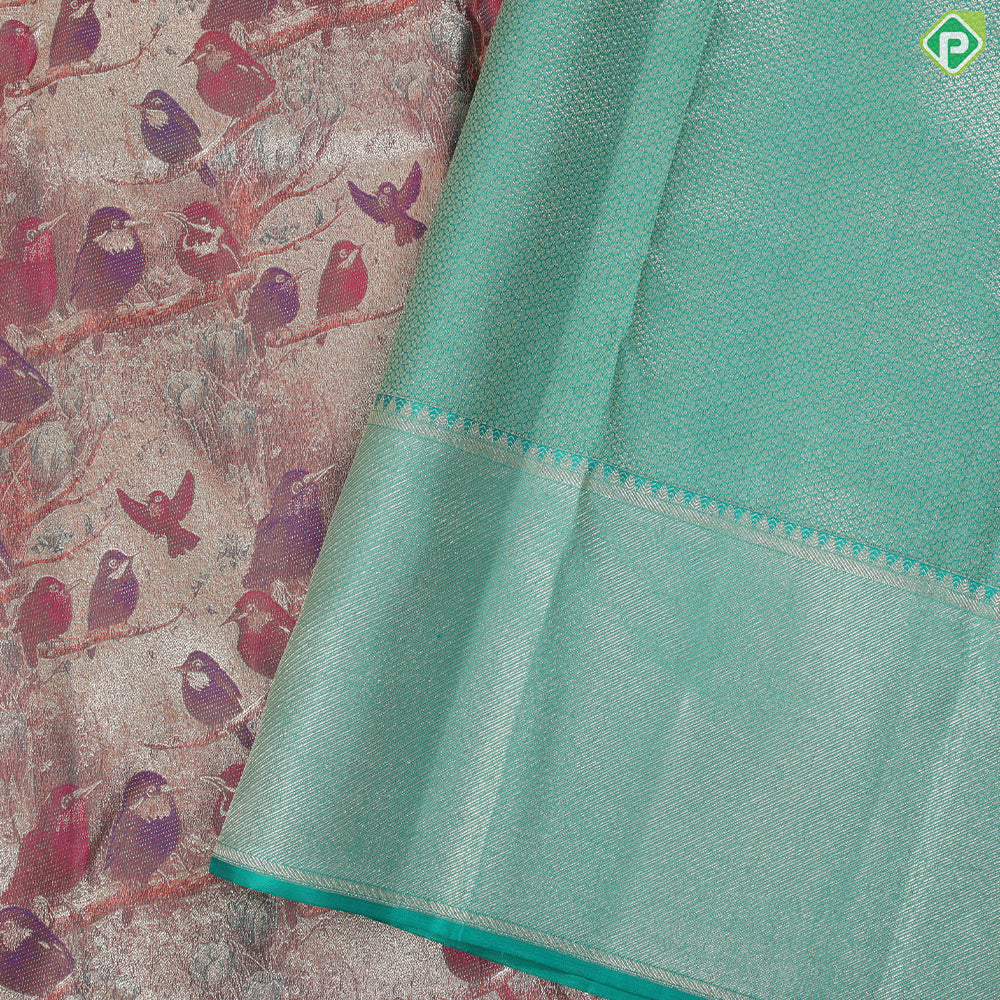 Brick orange multi color birds in forest inspired tissue contrast green silver gold zari diamond border trendy silk saree
