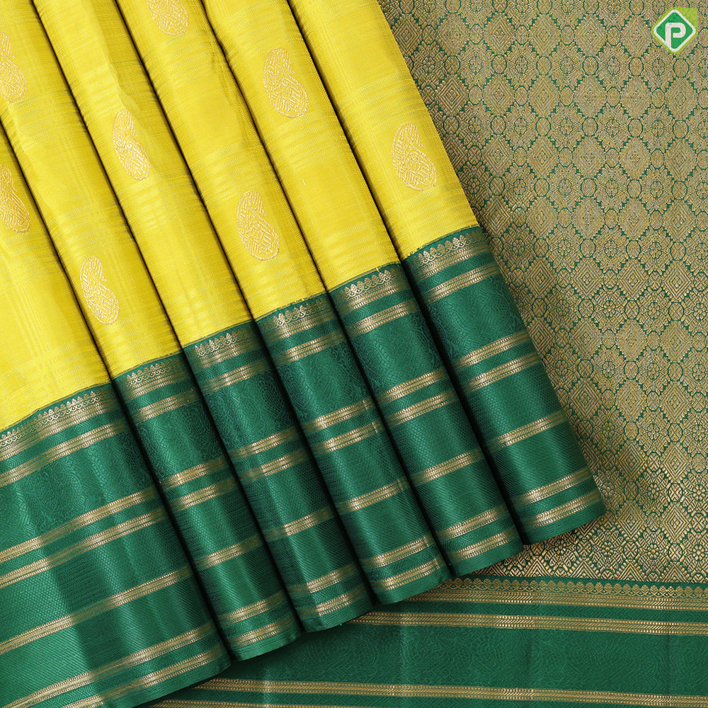 This traditional silk saree features a vibrant lemon yellow base adorned with elegant mango butta motifs and a subtle self-checkered pattern. Contrasted beautifully by a dark green pallu, it is enriched with a gold zari multi-line border that adds a refined touch of luxury. Perfect for festive occasions, this saree combines timeless craftsmanship with rich hues for a distinguished and graceful look.