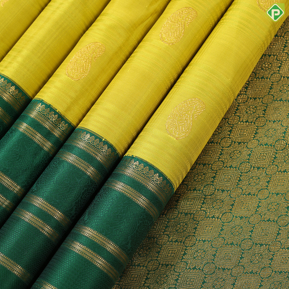 Lemon yellow with mango butta design dark green gold zari multi lines border Traditional silk saree