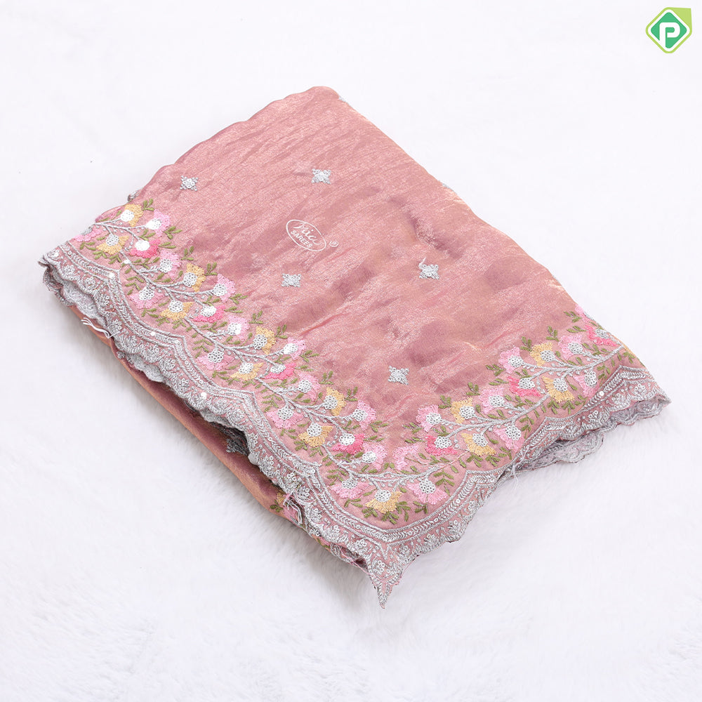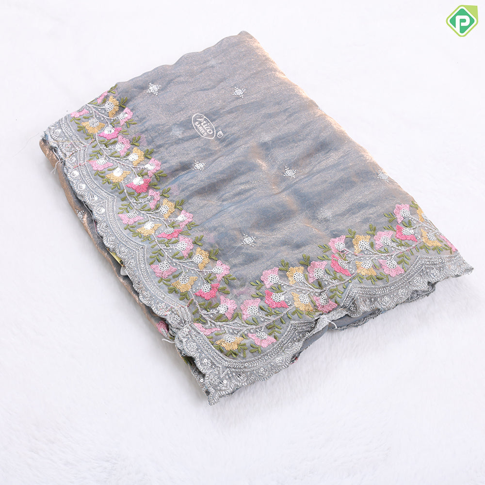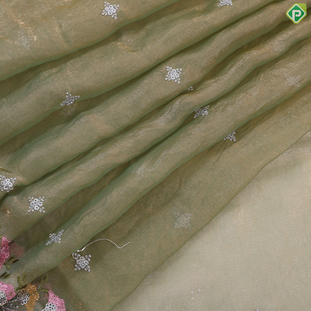 Mint green tissue effect diamond embroidered butta multi color floral cut work embroidery fancy saree