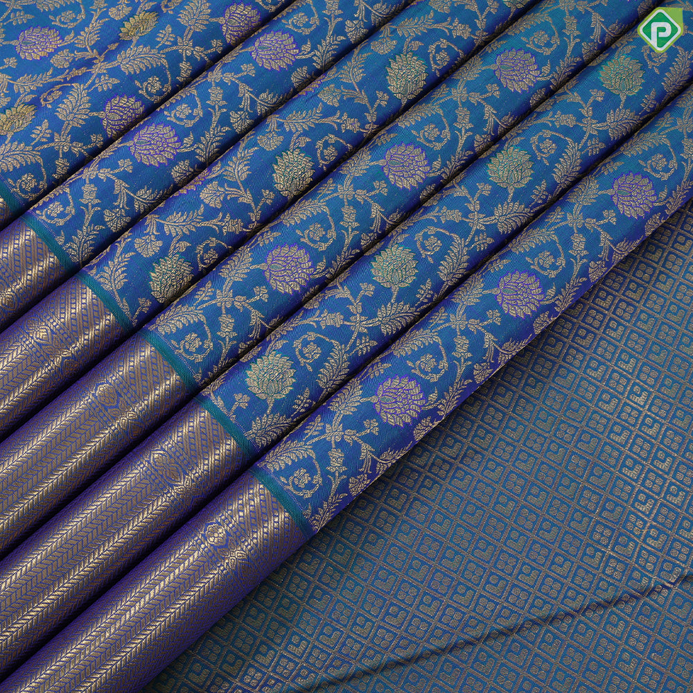 Elevate your bridal ensemble with this exquisite peacock green silk saree, a masterpiece of traditional craftsmanship. Adorned with intricate gold zari meena work depicting grand floral motifs, this saree showcases the finest artisanal techniques. The self-patterned gold zari striped border adds regal sophistication, while the luxurious silk fabric drapes beautifully. Perfect for weddings and grand celebrations, this heirloom-quality piece combines timeless heritage design with premium materials, ensuring you radiate elegance and grace on your special occasion.