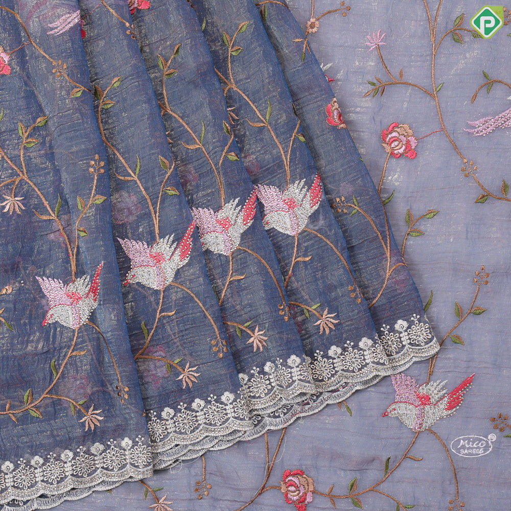 Porpoise grey tissue effect floral embroidered design edge cut work border Holly wood fancy saree