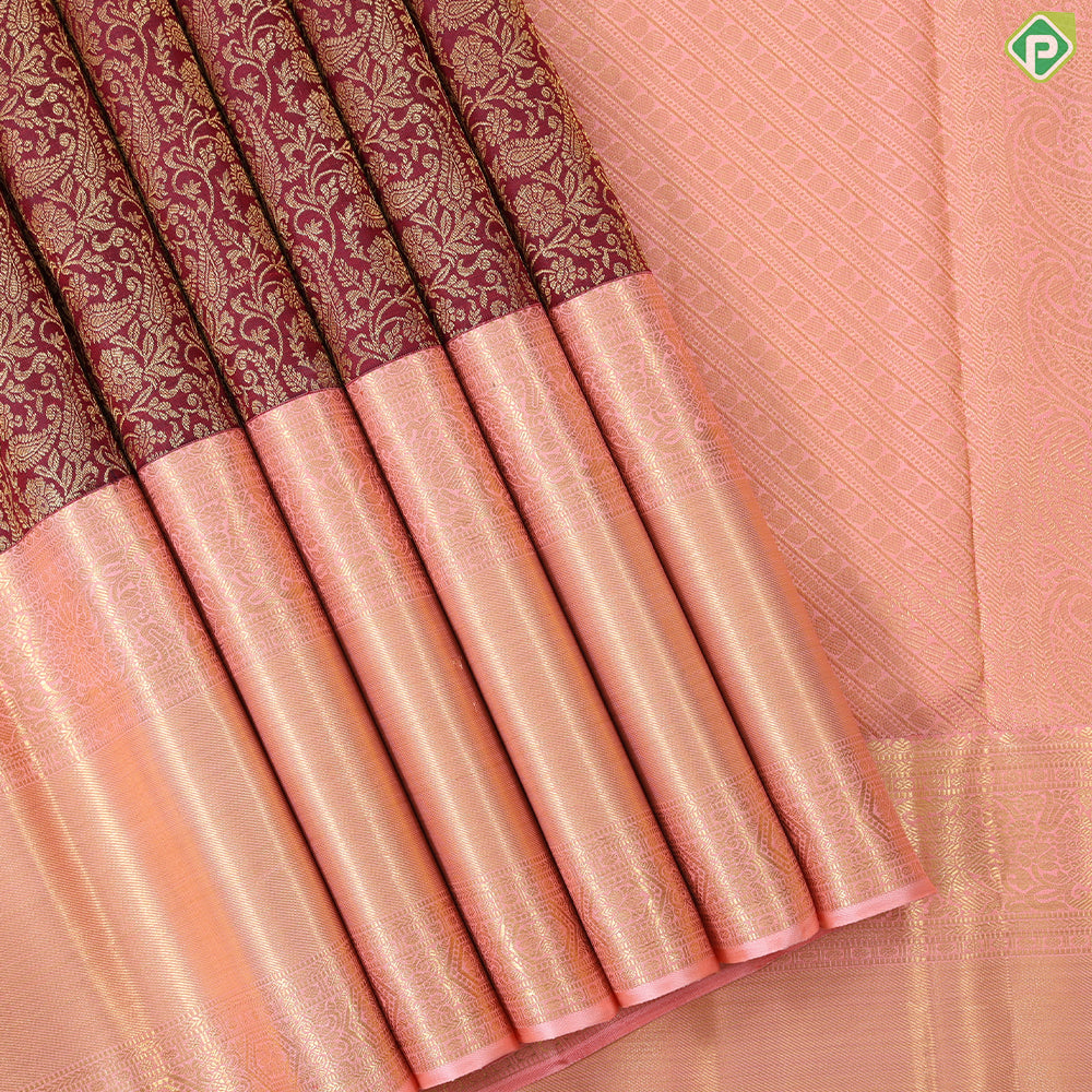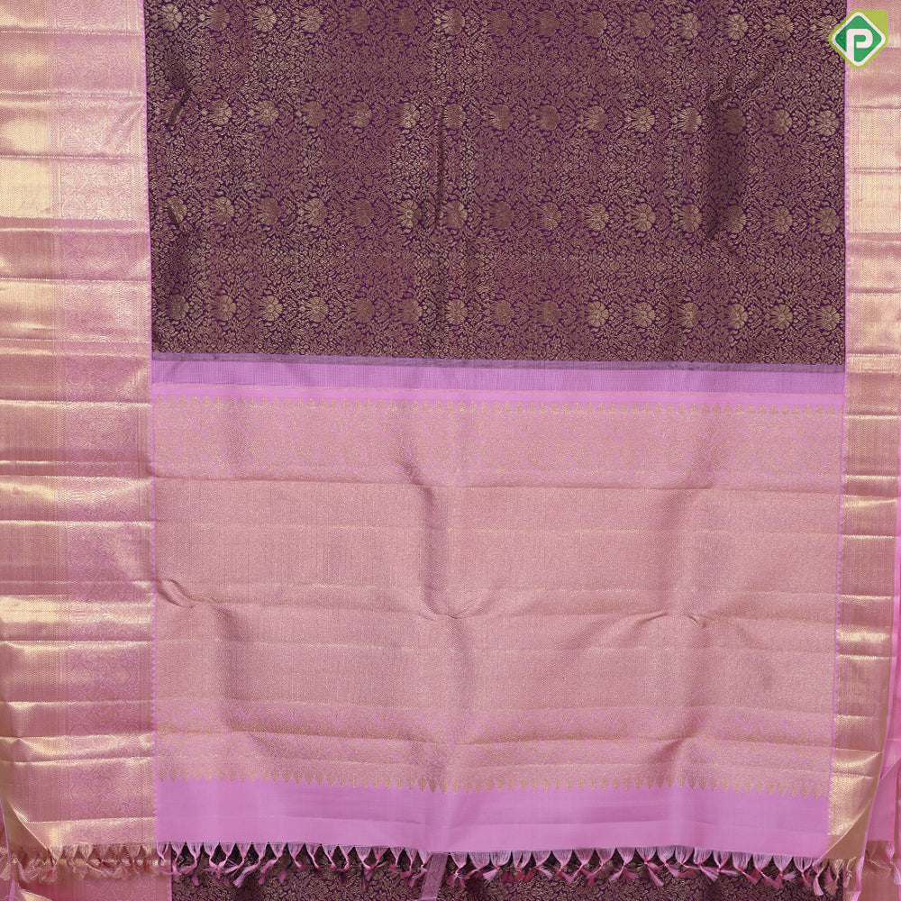 Purple Gold Zari Grand Floral Design Contrast Baby Pink Border Exclusive Bridal Silk Saree