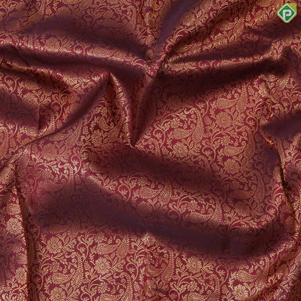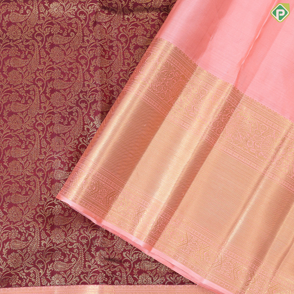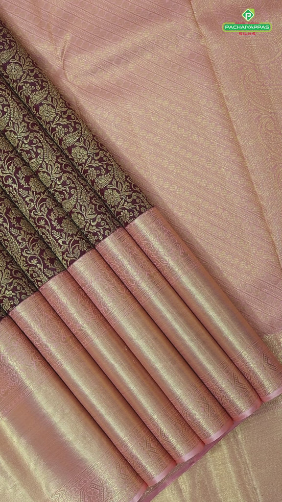 This exclusive bridal silk saree features a rich purple base adorned with an intricate gold zari grand floral design, exemplifying exquisite craftsmanship. The contrast baby pink border, highlighted with a delicate gold zari fancy Bavanji pattern, adds sophistication and vibrant elegance. Perfect for weddings and special occasions, this saree combines traditional artistry with luxurious textures to enhance your bridal ensemble with timeless grace.