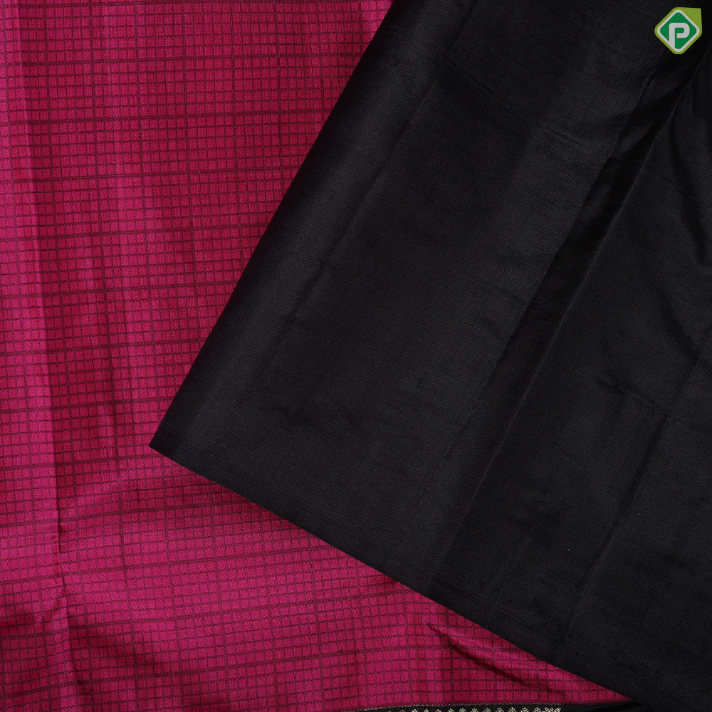 Rani pink black checks thread work design contrast luxury black gold zari border trendy silk saree